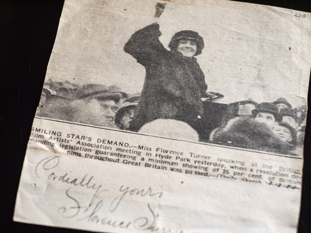 今回紹介するのは1923年にイギリスで残されたサインです。同年末、イギリスでは不振に陥っていた自国映画産業を保護するため、国内上映作品の1/4を国産にする法制度が整えられます。この際に組合のミーティングに参加しスピーチを行った記事がサインに糊付けされていました。英国で映画製作を行った実績があったからこそで、彼女の存在感や影響力が1920年代まで続いていた様子が伝わってきます。