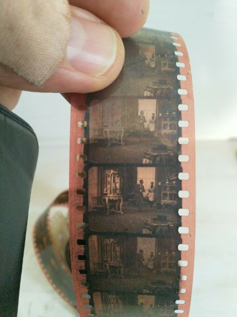 目視で内容を確認していきます。フィルムは3つの場面をつなげたものでした。赤の染色がほどこされていて場面によって濃さが異なっています。切れた部分をテープで補強した一ヶ所は樹脂が劣化しベタベタになっていました。他に小傷がある以外は比較的良い状態です。