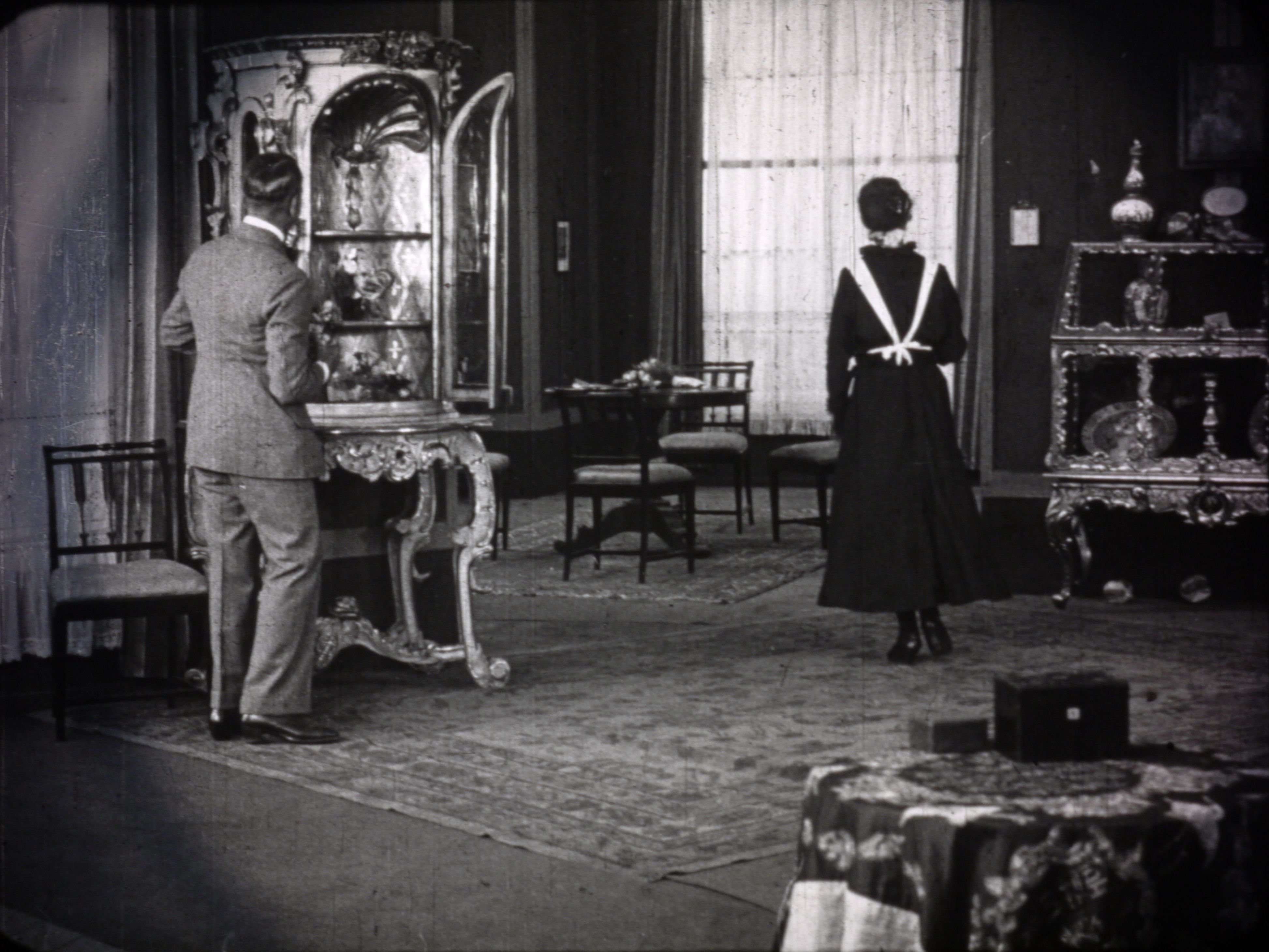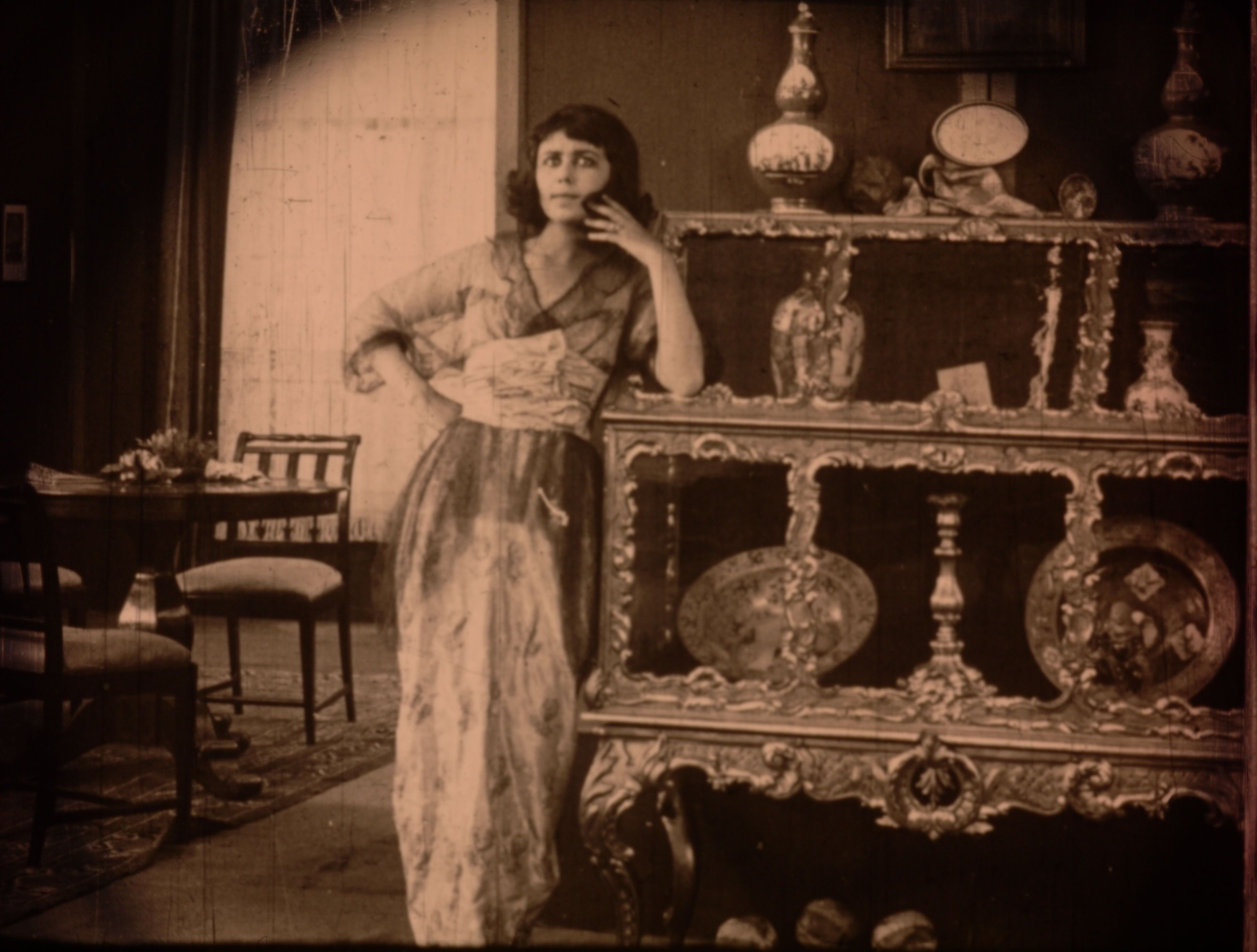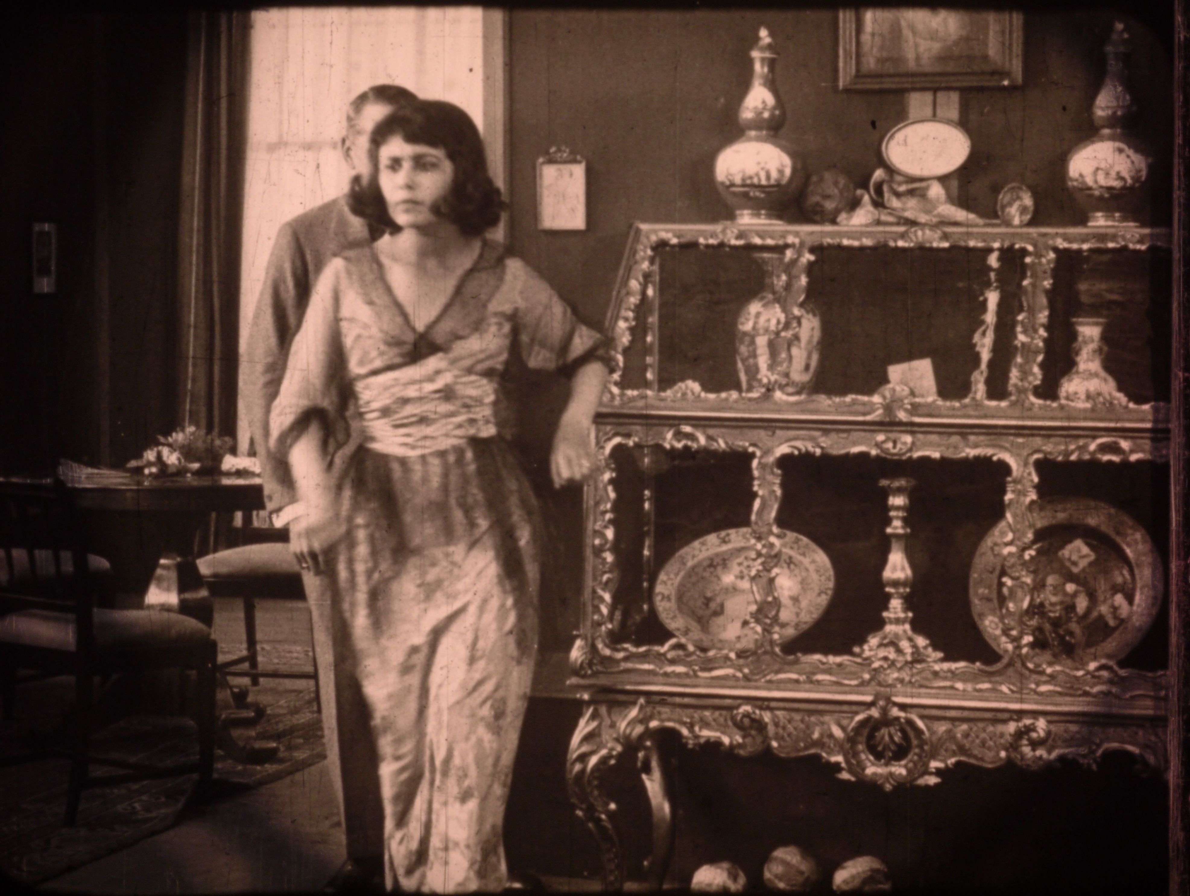 字幕やクレジットがなくタイトルは不明。商品説明に冒頭数コマを撮影した写真が添えられていました。室内装飾やカメラの構図など1910年代中盤の作品に見えます。この時期のフィルムは頻繁に出てくるものではないためやや博打ではあるものの取り寄せてみました。