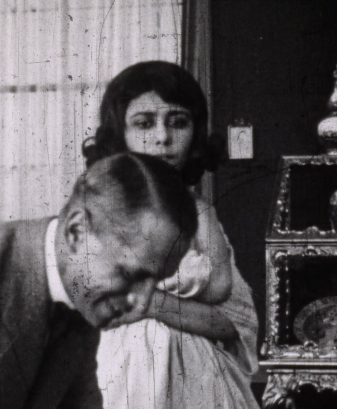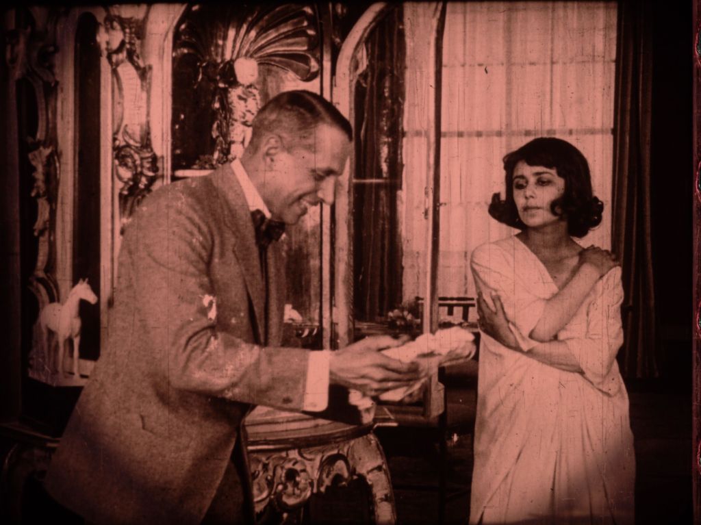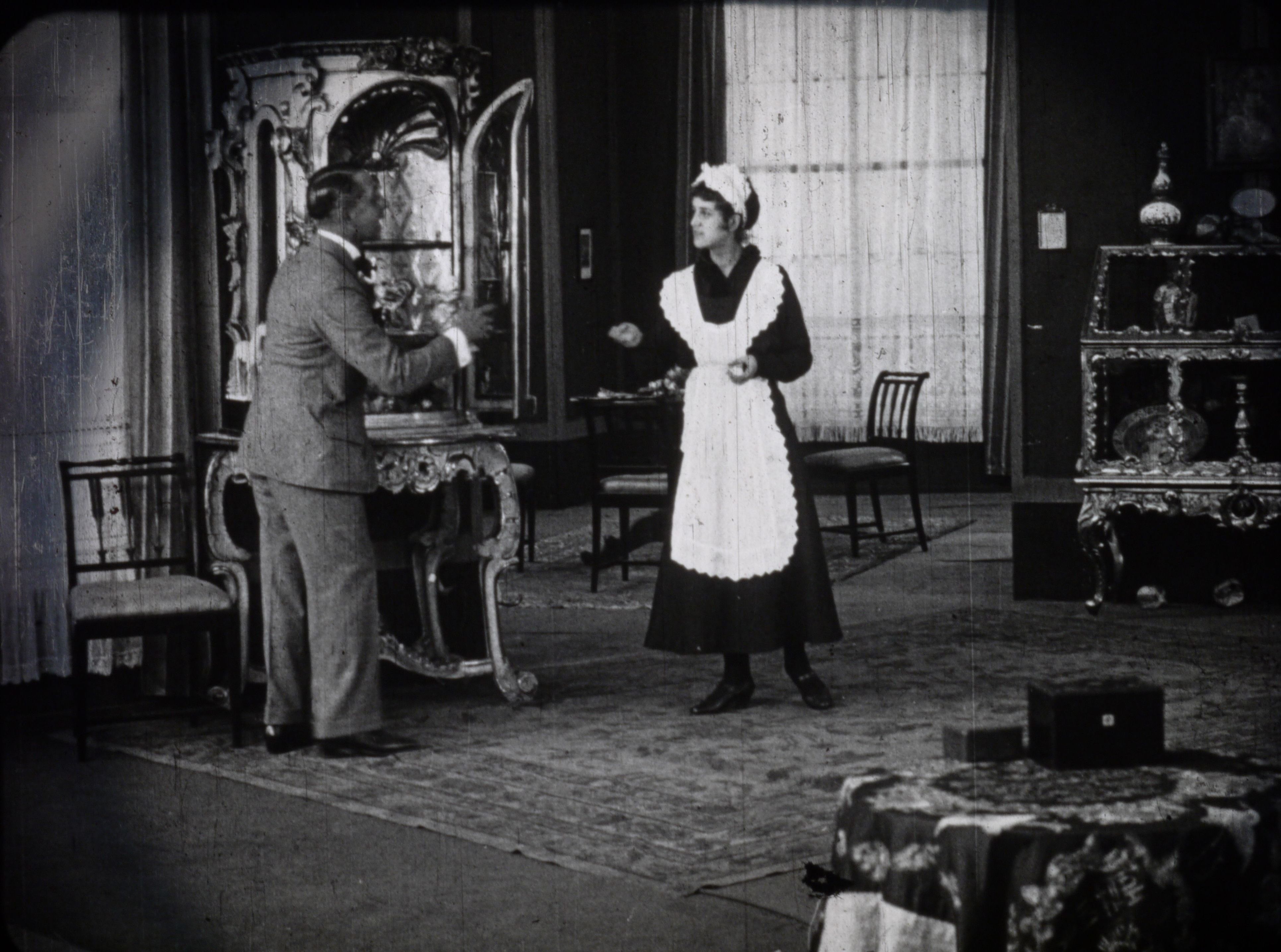 字幕やクレジットがなくタイトルは不明。商品説明に冒頭数コマを撮影した写真が添えられていました。室内装飾やカメラの構図など1910年代中盤の作品に見えます。この時期のフィルムは頻繁に出てくるものではないためやや博打ではあるものの取り寄せてみました。