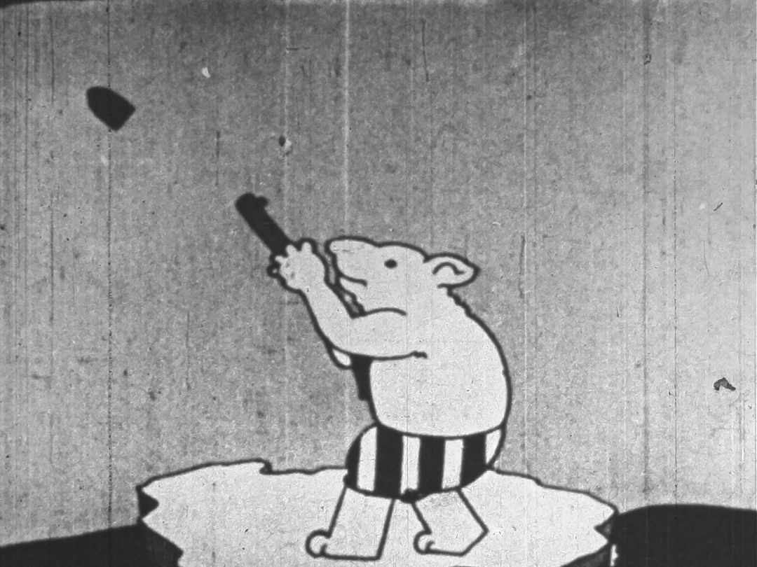 主人公が横方向に進んでいく発想、途中クルクル回る表現は以前に紹介した切紙細工アニメ『西遊記 孫悟空物語』(1926年、大藤信郎)と重なってきます。おぢさんの一挙一動や短パンを履いている白熊に愛嬌と抜け感があり、横スクロール型ゲーム風の感覚と相まって今見ても十分に面白いと思える作品でした。
