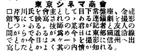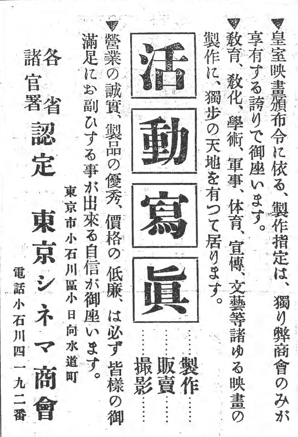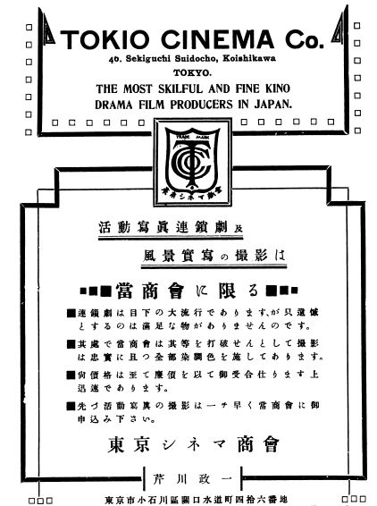 東京シネマ商会(※戦後1954年に設立された株式会社東京シネマ/現・東京シネマ新社とは別会社)は1914年(大正3年)に設立された映画会社。会主は芹川政一氏。設立当初より時事実写と連鎖劇撮影を得意としていました。教育用フィルムを多く含んだ伴野9.5ミリ作品とも縁が深く『動物の国』『大東京』などが東京シネマ商会によるものでした。