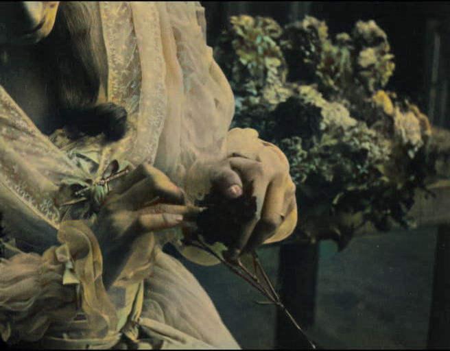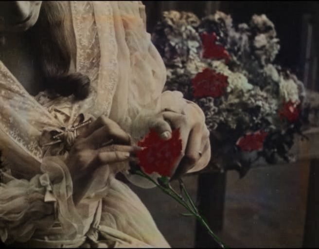 元画像を見ると花は黒く表現されていて、花びらの形が判別できないほど潰れています。この花が黒だったのか赤だったのか画像データからだけでは特定できません。ところが今回は、1)1910年代に制作された映画でオルソマチック・フィルムを使用、2)原作の対応部分で色が「赤」と指定されている。二つの重要な事実が残されている訳です。