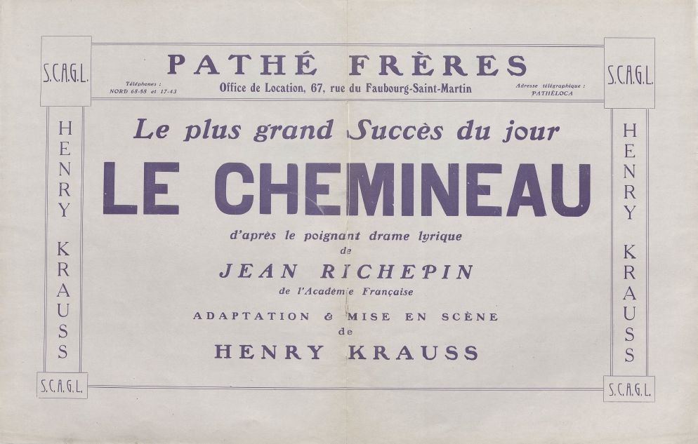 PATHE. – Cette semaine encore nous avons vu l’écran s’enrichir d’une oeuvre de J. Richepin, de l’Académie Française. C’est Le Chemineau (1200 mètres), “S.C.A.G.L.”, qui, après avoir triomphé théâtrement, a triomphé cinématographiquement grâce au talent du grand et sincère artiste qu’est Henry Krauss, metteur en scène et principal interprète du chef-d’oeuvre de poésie humaine qu’est Le Chemineau, type accompli de l’homme épris d’indépendance, travaillant tantôt ici, tantôt là, chantant les plus belles chansons, faisant tourner les têtes et affoler les coeurs.