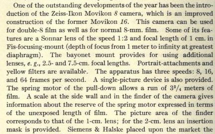 今年になって突出した進歩を見せたひとつがツァイス・イコン社によって導入されたモヴィコン8カメラで、先行のモヴィコン16の機構に多くの改良を施している。同機はダブル8だけではなくノーマル8用フィルムにも対応。焦点距離1センチ、f値1:2のゾナー・レンズを採用しているのが特徴である […]。