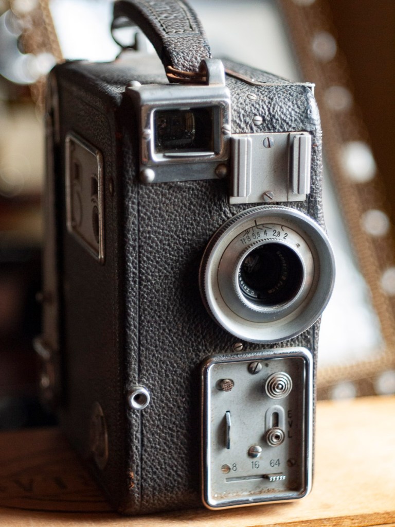 パテ社のモトカメラにも似た王道のデザイン。1933年に市販開始されたもので今回入手した初期型が1937年まで流通、その後マイナーチェンジを加えた改良機「K8」に道を譲っています。撮影速度は毎秒8コマ/16コマ/64コマの三速。静止画の撮影機能も付いています。ダブル8のみならずノーマル8にも対応、8ミリの撮影形式が移行していく時期である様子が伺えます。