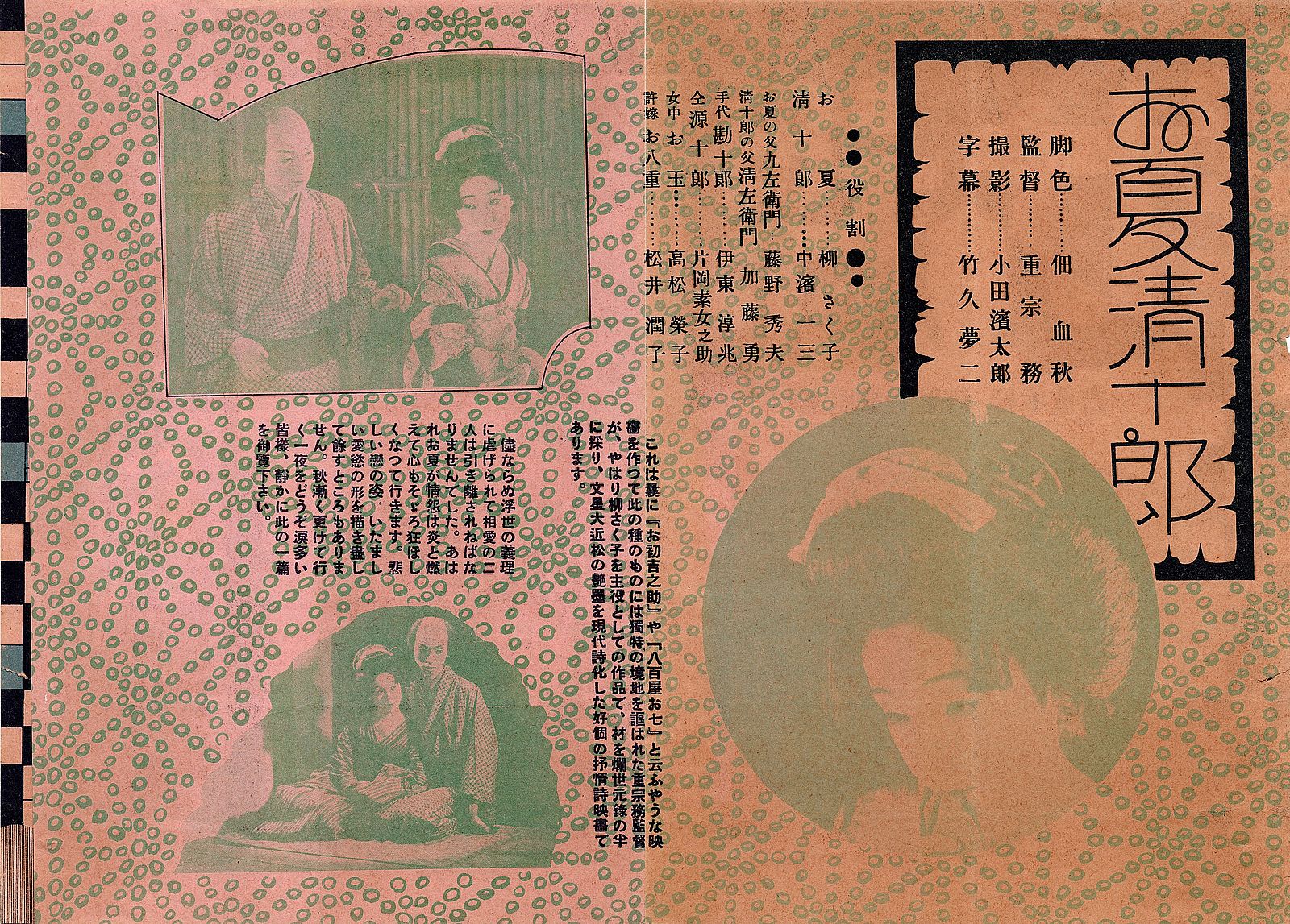 「儘ならぬ浮世の義理に虐げられて相愛の二人は引き離されねばなりませんでした。あはれお夏が情怨は炎と燃えて心もそゞろ狂ほしくなつて行きます。悲しい戀の姿、いたましい愛慾の形を描き尽くして餘すところもありません。秋漸く更けて行く一夜をどうぞ涙多い皆樣、靜に此の一篇を御覧下さい」