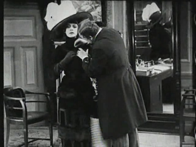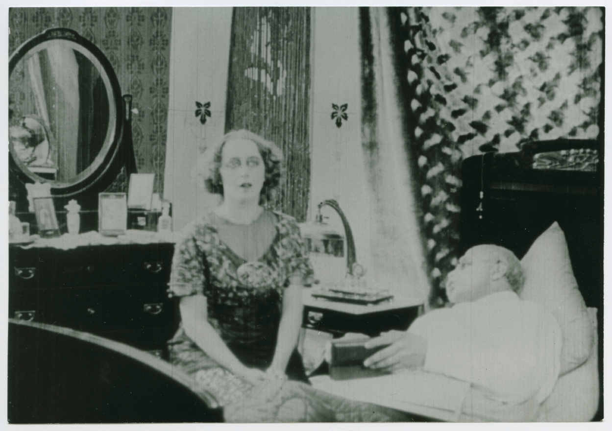 1911~12年頃の北欧映画では部屋の一画に鏡を配する手法が見られました。カメラを固定し、室内を引きで撮影し続けるとその映像は心理的な圧迫感、閉塞感を与えます。鏡を置くとその先に角度の異なった空間の広がり、奥行きが見えるためストレスを軽減することができます。『二人静』のカメラワークはこういった1910年代前半の室内撮影の語り方と近しいものです。