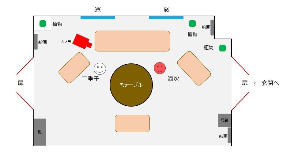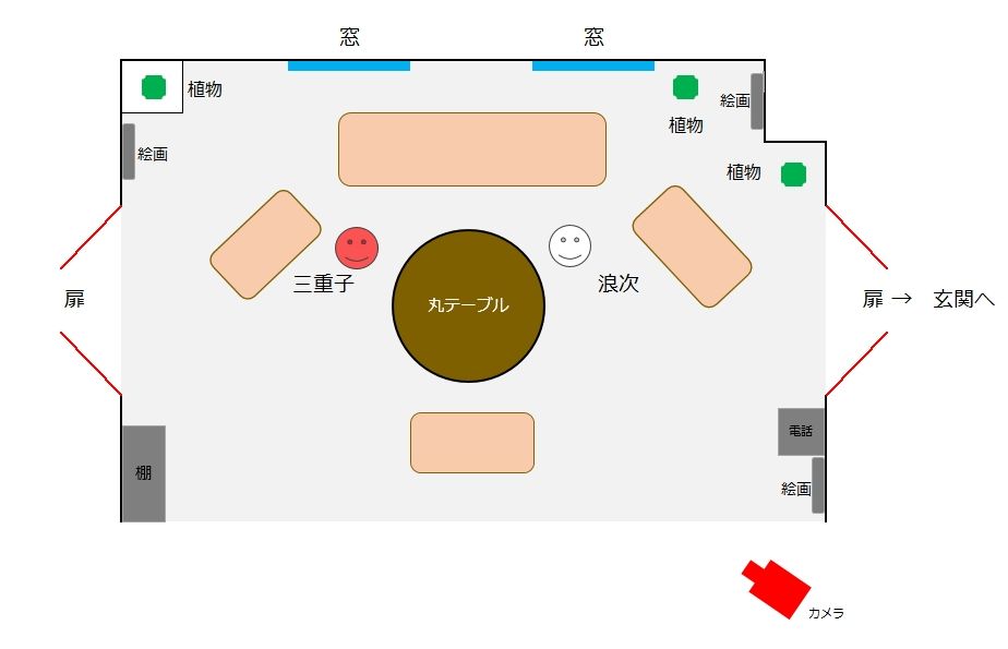続いて浪次を捉えた映像を見ていきます。部屋の対角という「型」を当てはめていくならカメラを左に寄せ、図で言うと左下から右上への向きで撮影すれば良いように思われます。ところが実際の映像はカメラはセットに入りこんでおり、三重子が立つ位置にほど近い一画から撮影されています。この位置をあえて選んだ理由を断定はできませんが、ショット1と6のどちらも植物が写りこみ、背後に扉が見えている点を考えあわせると三重子を撮影したショットと構図を揃えたかった、という仮説は成り立つと思います。