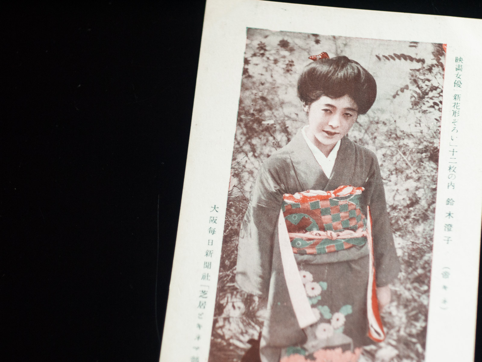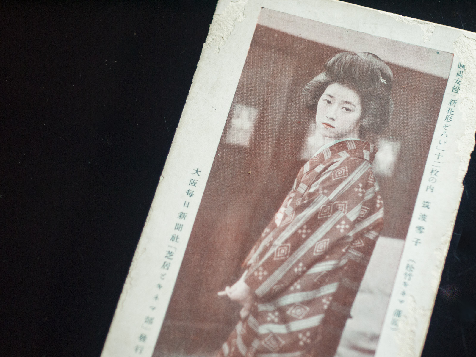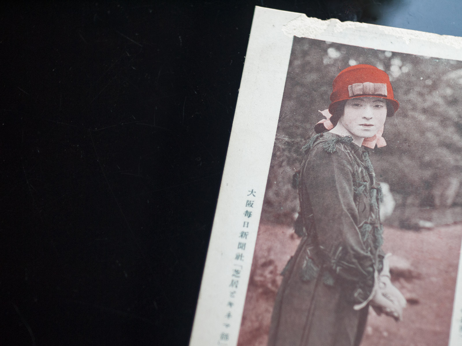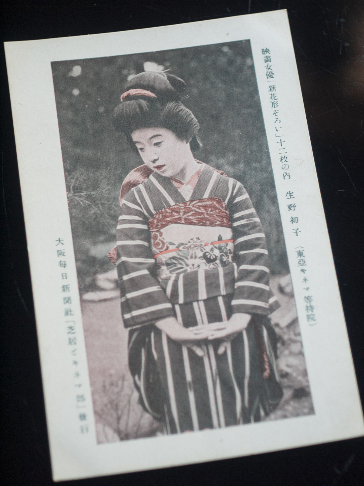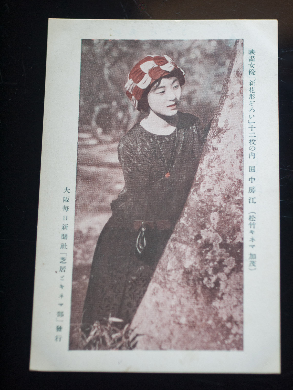 一枚「田中房江(松竹キネマ加茂)」とあるのは田中絹代さん。1925年夏に蒲田撮影所に移る以前、1924年末のデビューから25年初夏までは下加茂所属でした。ちなみに彼女は以前に紹介した小説版『落武者』表紙でも名前にミススペルが見られます(「田中菊代」)。現在では考えにくいレベルのミスですが、デビュー直後は名前と顔がまだ対応していない人も多かったと思われます。