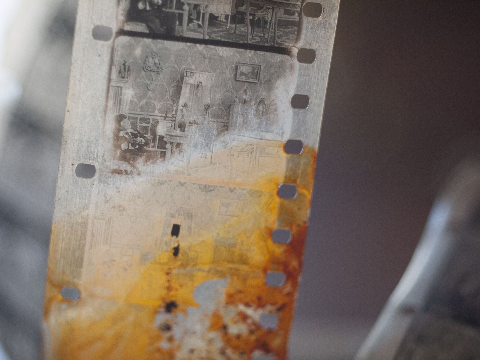 取り寄せてみた実物がこちら。冒頭が欠落してタイトルが不明、結末部に缶の錆が移った劣化が目立ち「結(Fin)」の語がありません。字幕による説明は含まれていませんでした。