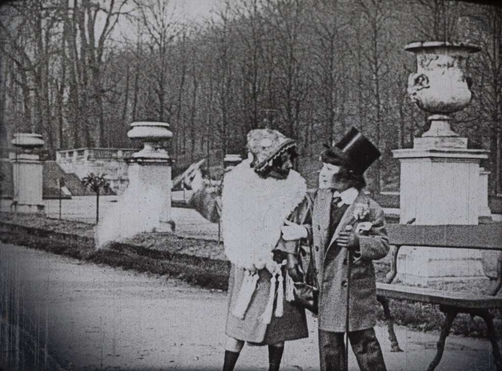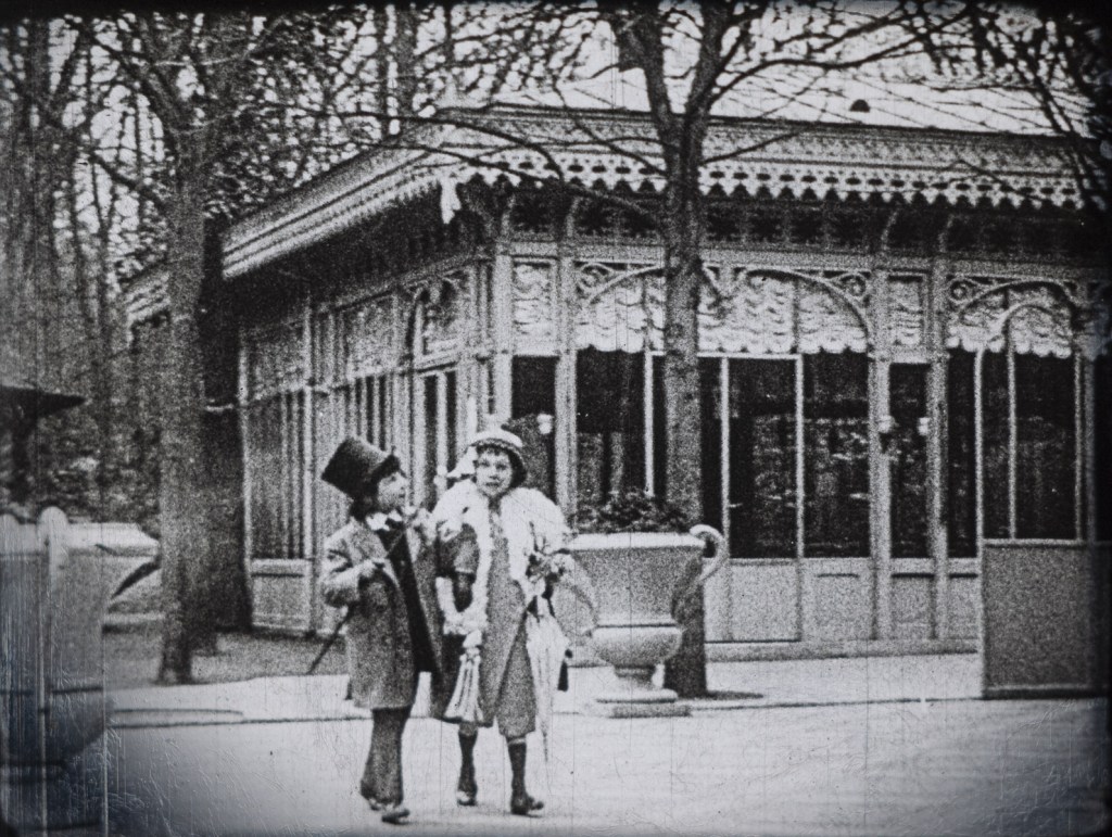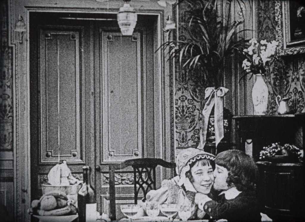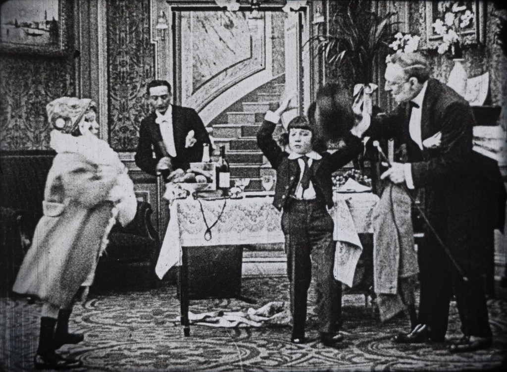 心のどこかでアラームが鳴りました。フィルムと缶が対応していない気がするのです。『御伽話』は1905年の作品で、メリエス直系のトリック・フィルムです。『我ら音楽隊大会に出場す』は1907年とされる音楽物喜劇で主に屋外ロケで撮影された一作。フィルムの方は室内撮影でしかも子供が写っています。ハッキリと見えないもののおかっぱ姿の少年にも見えます。