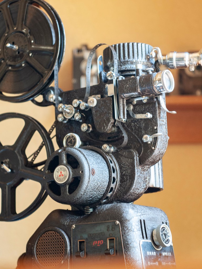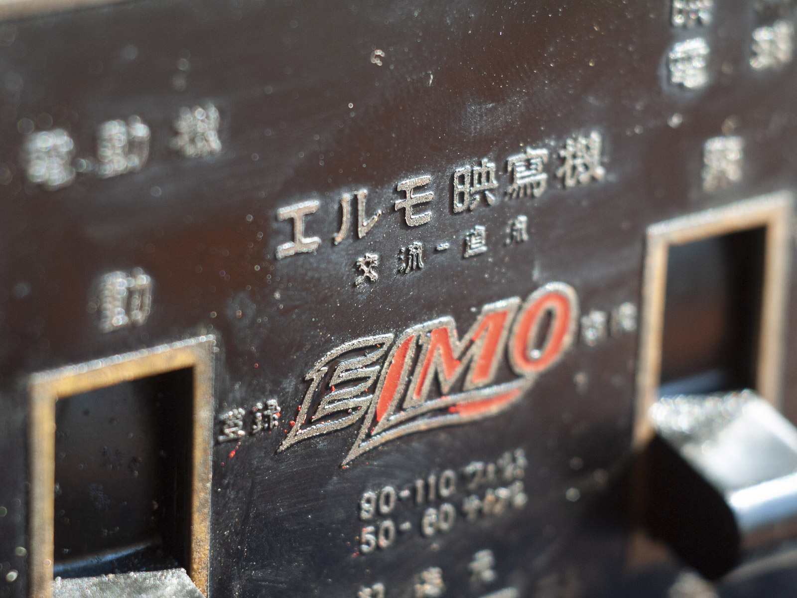 フィルムを装填して試運転。排熱システムを備えておらずランプハウスの上しか熱の逃げ道がないため映写しているとレンズ部まで熱くなっています。またモーター音がやや大きめ。それでもフィルム送りにがたつきがなく解像度が高めで期待以上のアウトプット。アルマ映写機が金属製ベルト3本必要なのに対してエルモF型は1本だけで動かすことができ手間が少ないのも好印象です。