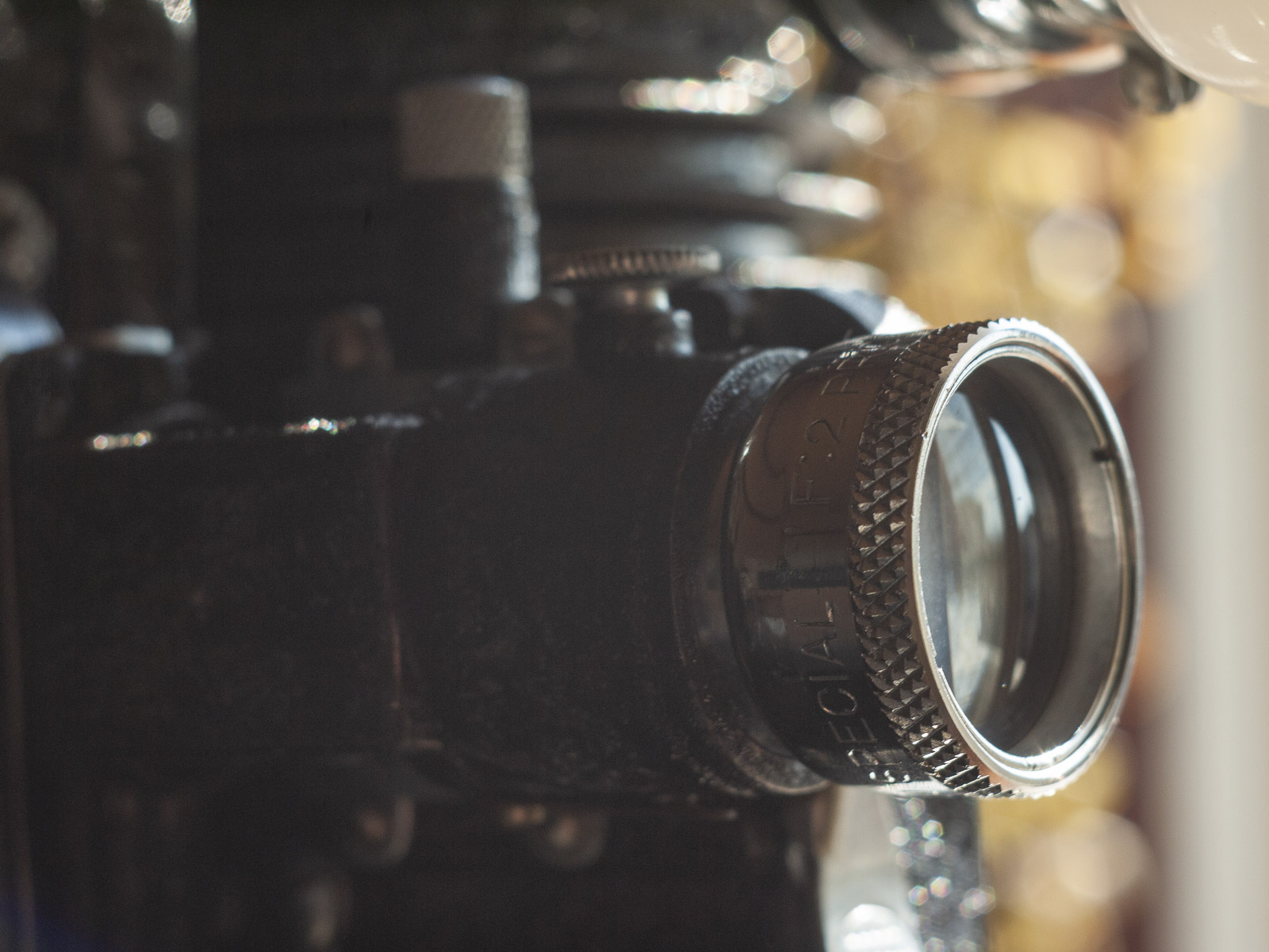 レンズは「エルモ社スペシャル F:2 プロジェクション・レンズ」(写真左)。躍進號を入手した際に16ミリ用のF:2(写真中央)と8ミリ用のF:1(写真右)を入手していて、今回9.5ミリ用にF:2がもう一本追加された形。焦点距離の表記はF:2で同じなのですが、規格が多少異なっており実写時に投影サイズにも違いが見られます。