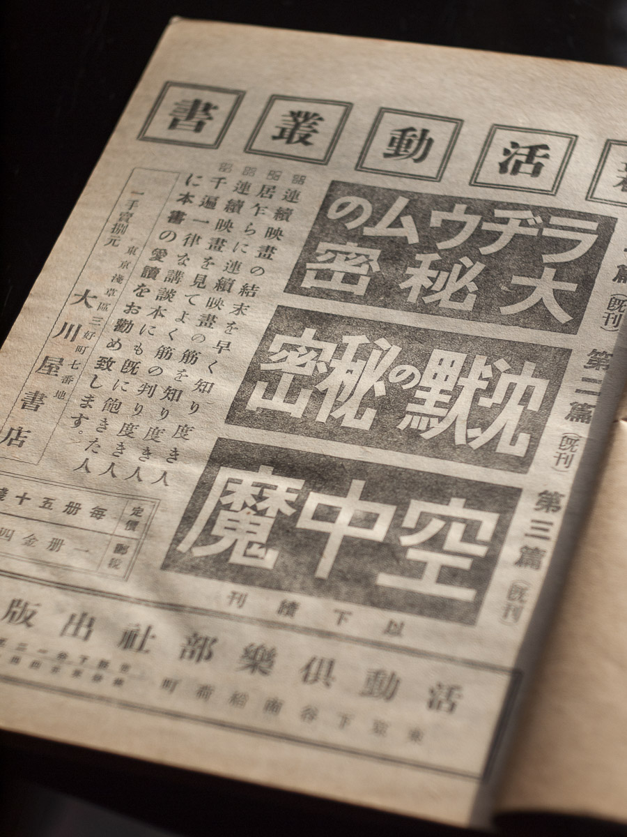 また活動倶楽部社が新雑誌(「オペラ」)や新叢書(「活動叢書」)、臨時特別号(「寫眞帖」)、名鑑(「世界活動寫眞俳優名鑑」)を矢継ぎ早に公刊していたのがこの時期であちこちに広告が挟まれています。このうち『空中魔』は国立国会図書館でデジタル閲覧可能です。