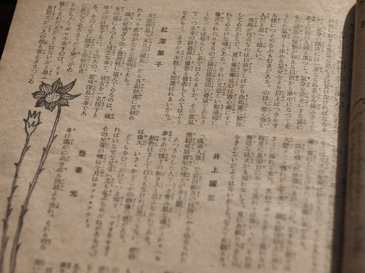特集記事として森富風太氏が「性と映畫劇」、若樹華影氏が「性的方面より見たる歐洲の名花達」を寄稿。カタノ・アケジ氏によるゴシップコレクション「日本映畫俳優の噂(一)」も関連記事と見てよさそうで紅澤葉子や吾妻光、栗島澄子等が扱われています。