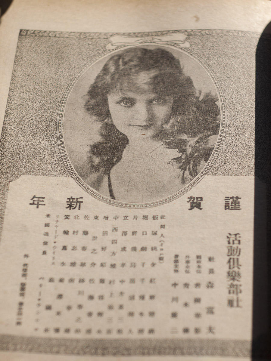 1922年1月号は「新年特別増大號」と題され本文146頁+グラビア32頁+折込+付録の豪華版となりました(付録は入手できず)。表紙はコンスタンス・タルマッジです。