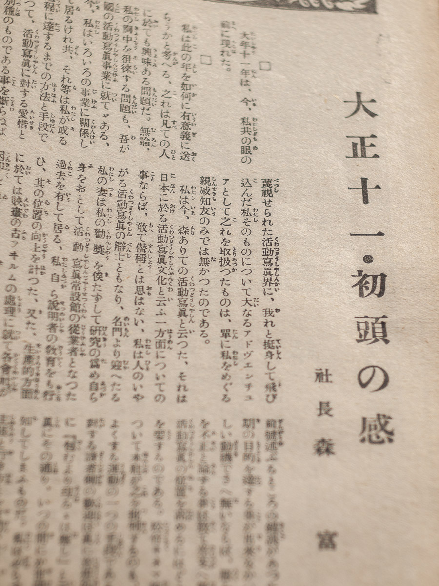 雑誌冒頭に活動倶楽部社社長・森富太氏からの「大正十一・初頭の感」と編集部一同からの謹賀新年の挨拶が置かれていました。
