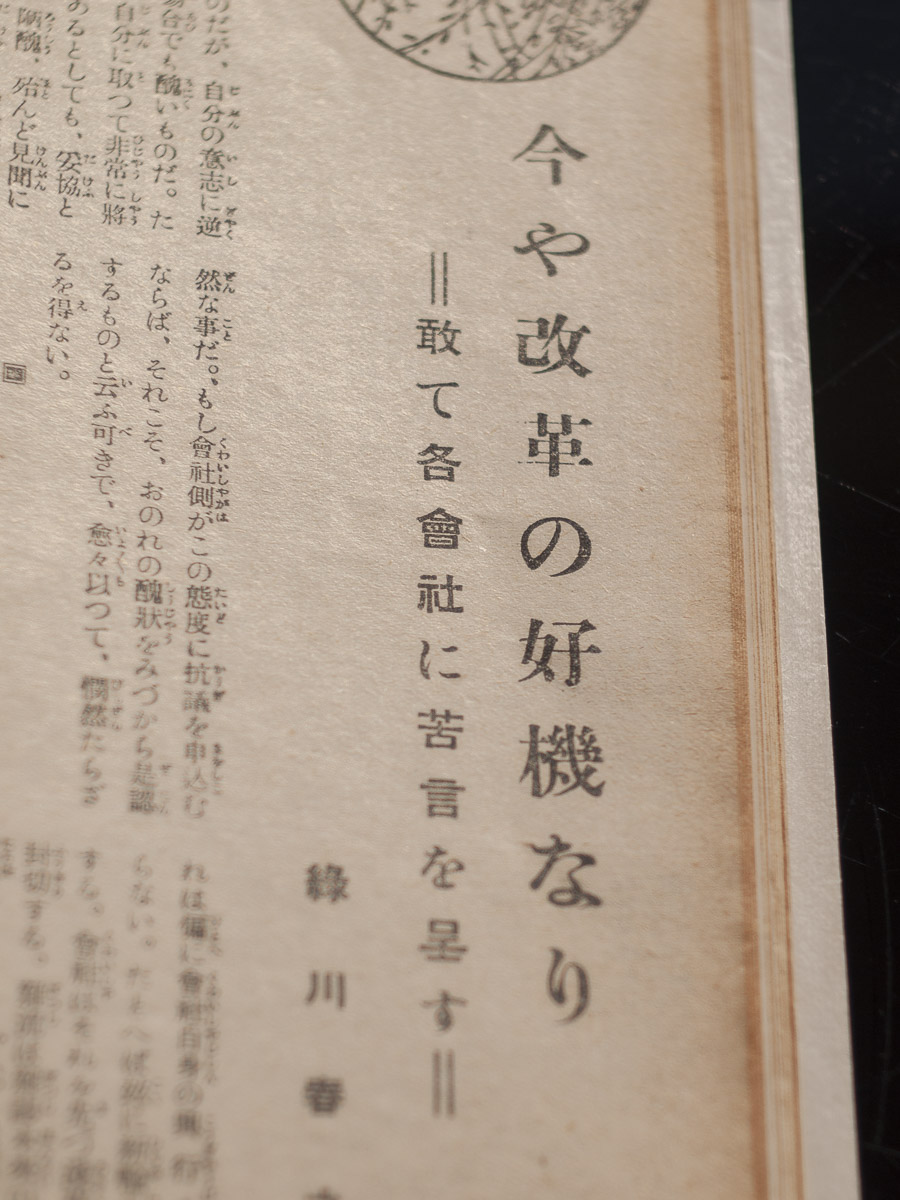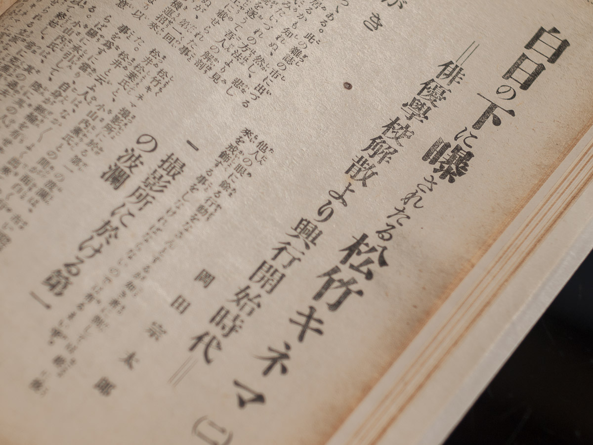 前号を受け、松竹キネマの実態を曝露・告発した「白日の下に曝されたる松竹キネマ(二)」とその反響をまとめた記事を掲載。綠川春之助氏による「今や改革の好機なり」は「敢て各會社に苦言を呈す」の副題通り、業界全体の刷新および改善を訴えたものです。