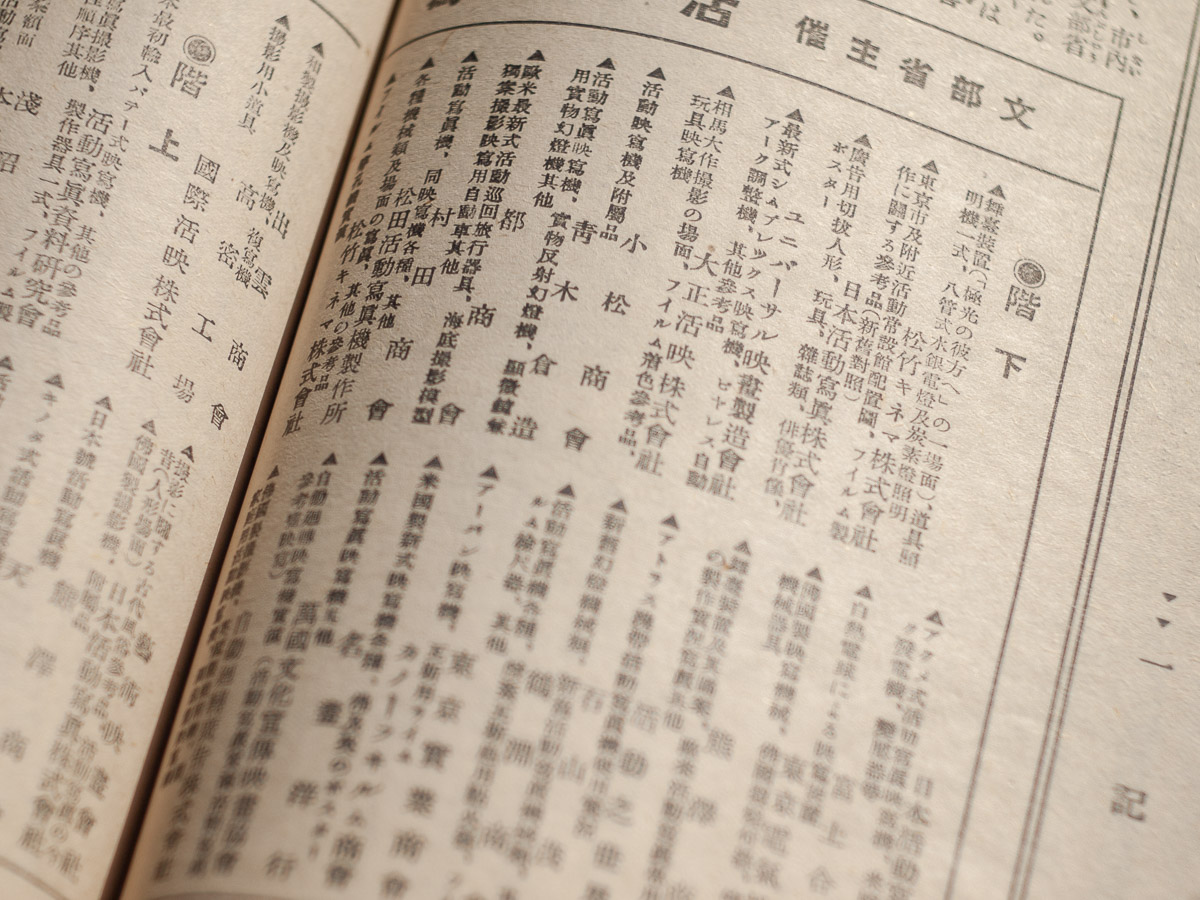 関連省庁、映画製作・配給会社(松竹、日活、國活、大活、ユニバーサル)、映画館、光学機器メーカー(小西六)、雑誌社、新聞社、説明弁士(生駒雷遊、駒田好洋、中川慶二)の名が並ぶ様は壮観。出品物は撮影機、フィルム、撮影用衣装及び小道具、ポスターやチラシ、映画館設計図など。先日投稿した尾上松葉出演、松之助主演作『史劇 楠公訣別』実演と撮影も含まれています。