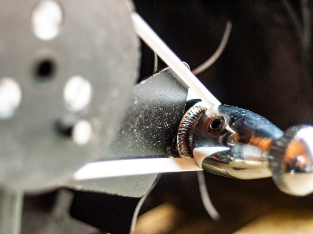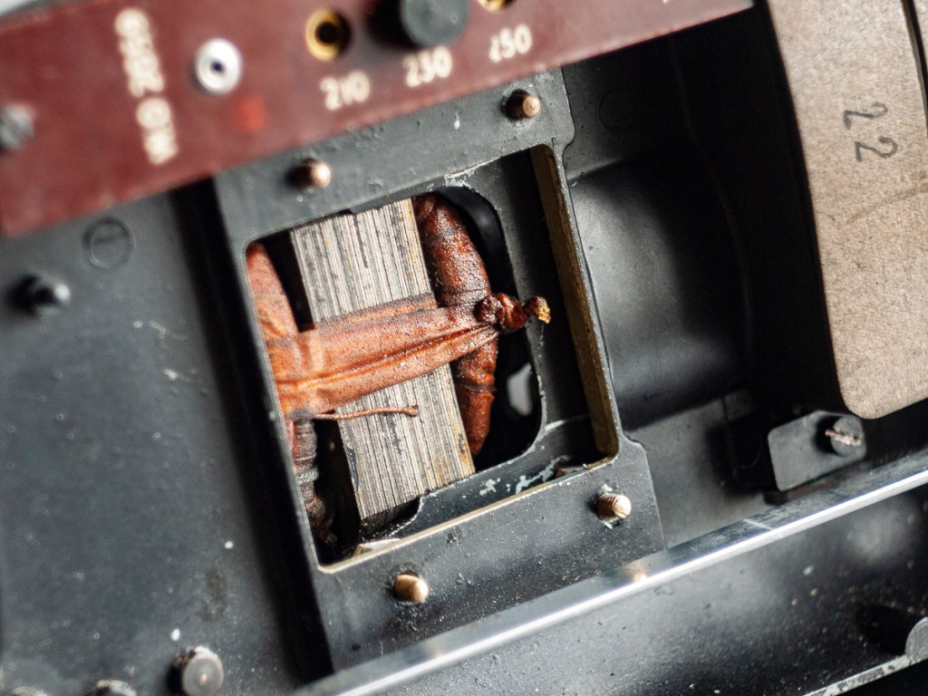 ここまでは想定内。ベルトに関してはサイズさえ選べば幅広かつ肉厚の輪ゴムで代用可能です。替わりのベルトをセットして動作確認…したところ上手くいきません。ベルトをはめると主軸が左にずれてしまいシャッター羽根が回転する際に干渉してしまうのです。