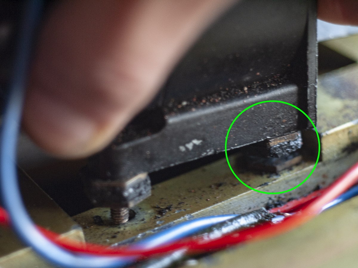 図で示すとこんな感じ。モーターを収める箱の四隅に金属の脚がついています。この脚は振動防止の緩衝材をかませた上で底板に留めてあります。金属/ゴム/金属でサンドイッチになった構造です。このゴムが経年劣化を起こし2ヶ所で接着が剥がれてしまっていました。