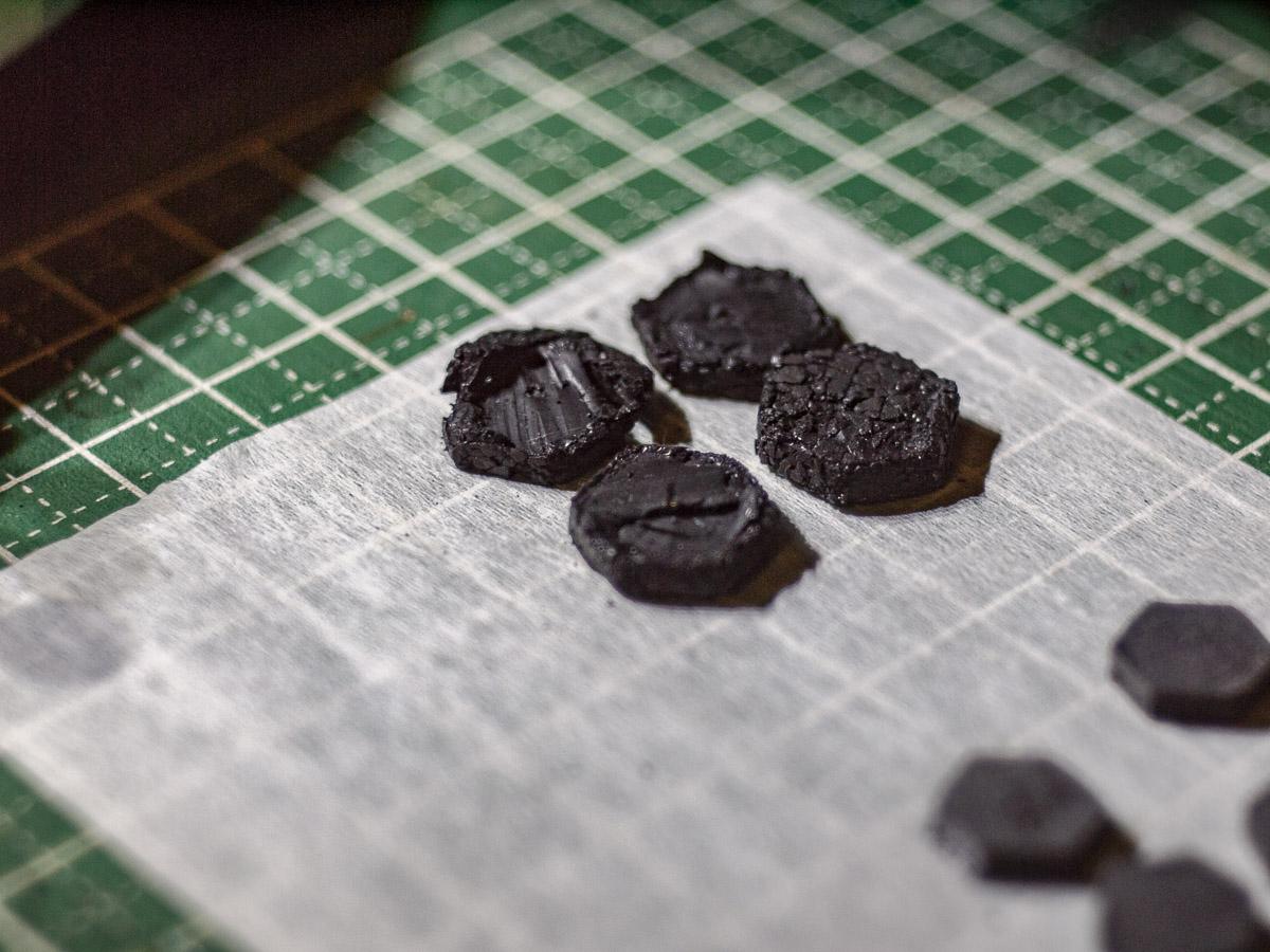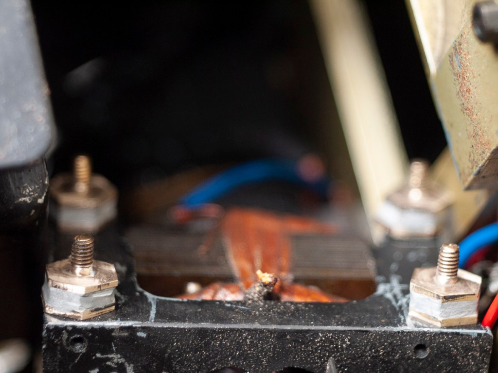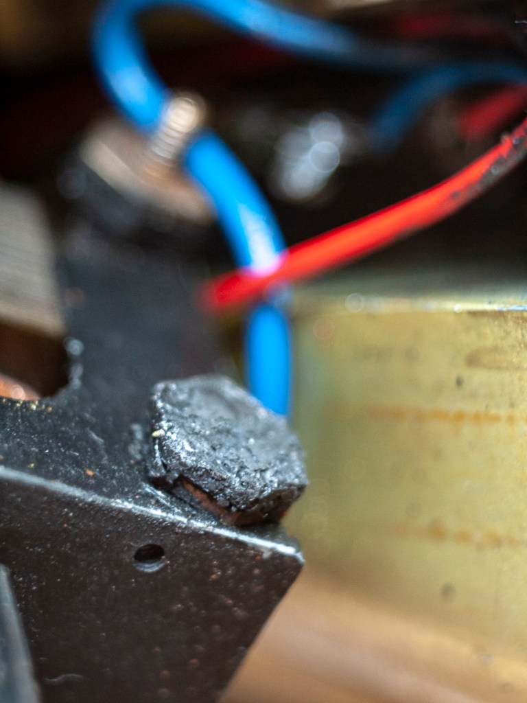 ボロボロに劣化した六角形のゴム製パーツ。配線に飛び散った黒い汚れも劣化したゴムの破片です。