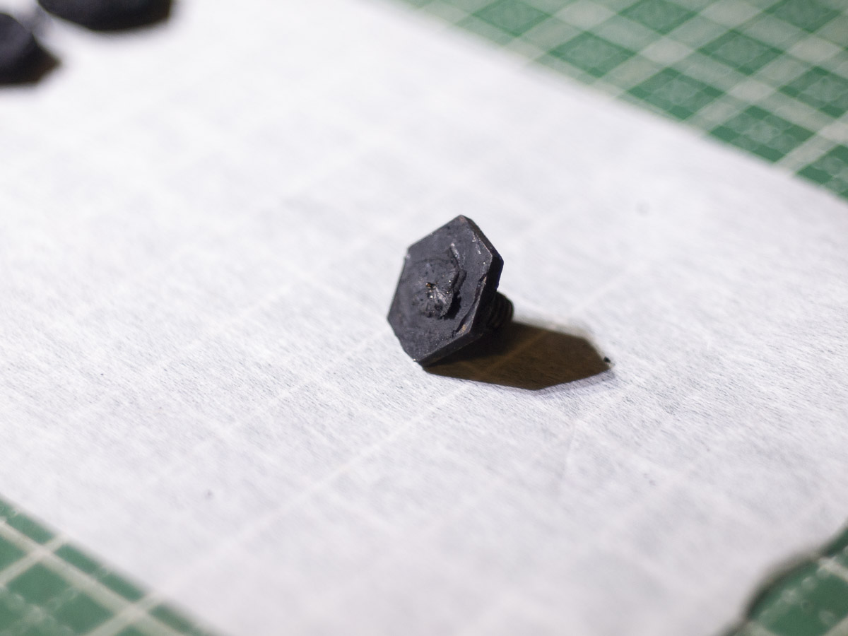日が変わって作業再開。硬化状況を確認し、はみ出したパテを削り落としていきます。