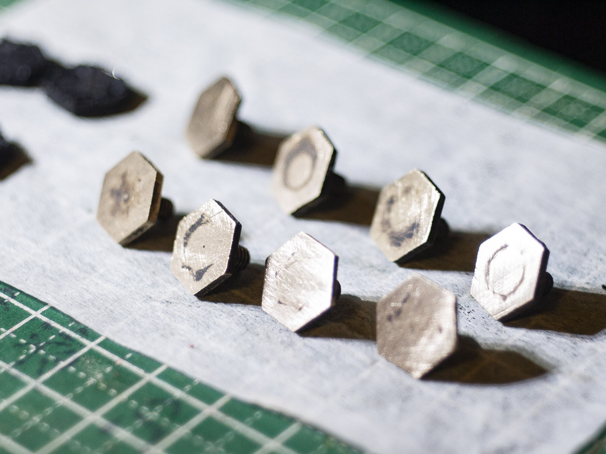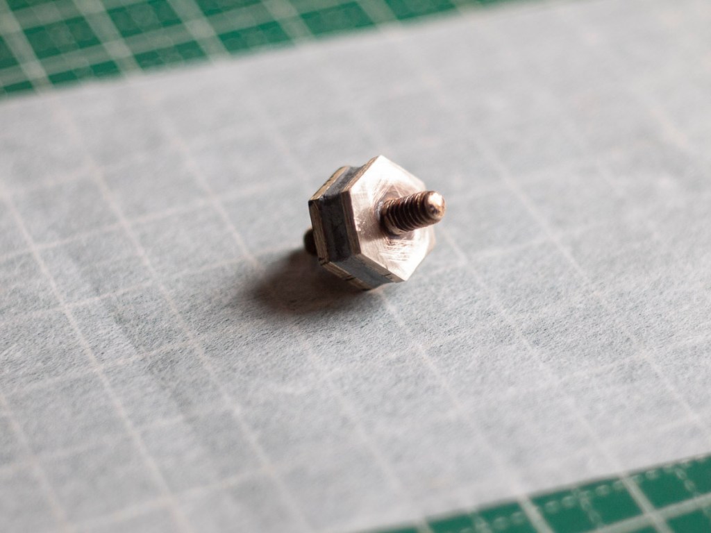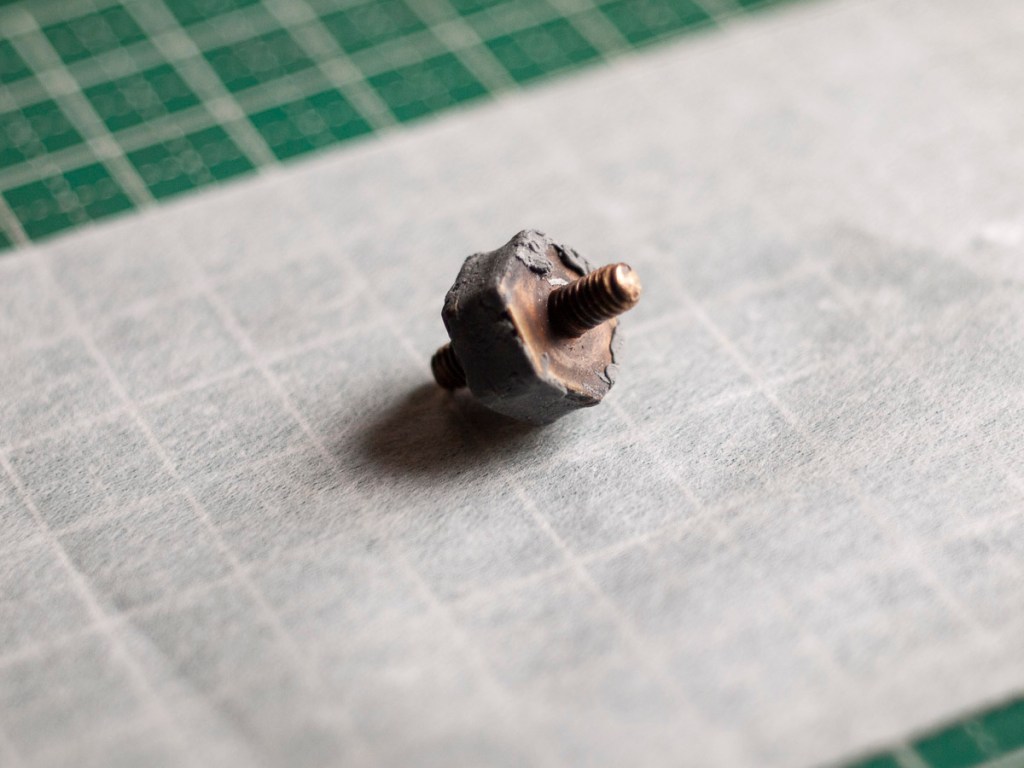 今回の作業イメージです。厚みを確保し、位置を決めるために樹脂製パーツを金属部品に接着(左)、その後 メタルパテを1ミリ幅ほど流しこんで全体を一体化(右)。3ミリ厚の鉄板から六角形を切り出し溶接したいところですが、そこまでの技術やツールが手元にありません。今回は出来る範囲の修復を行い上手くいかなければ業者に委託する形にしました。