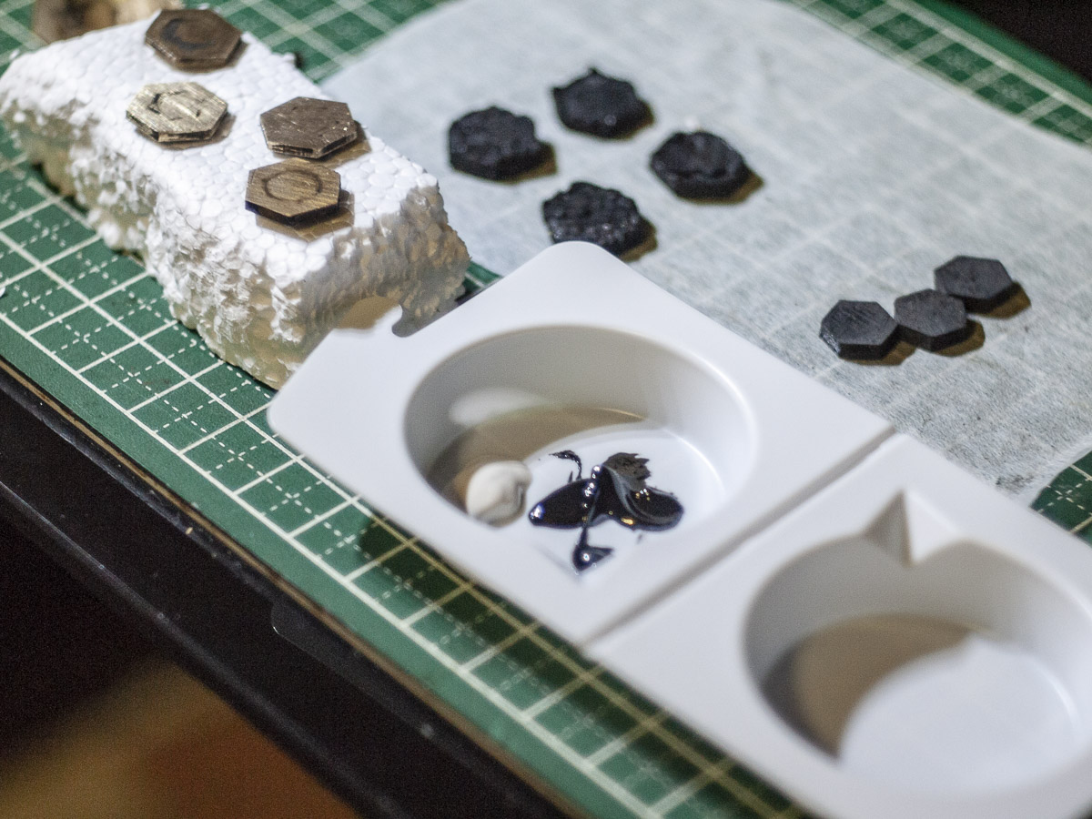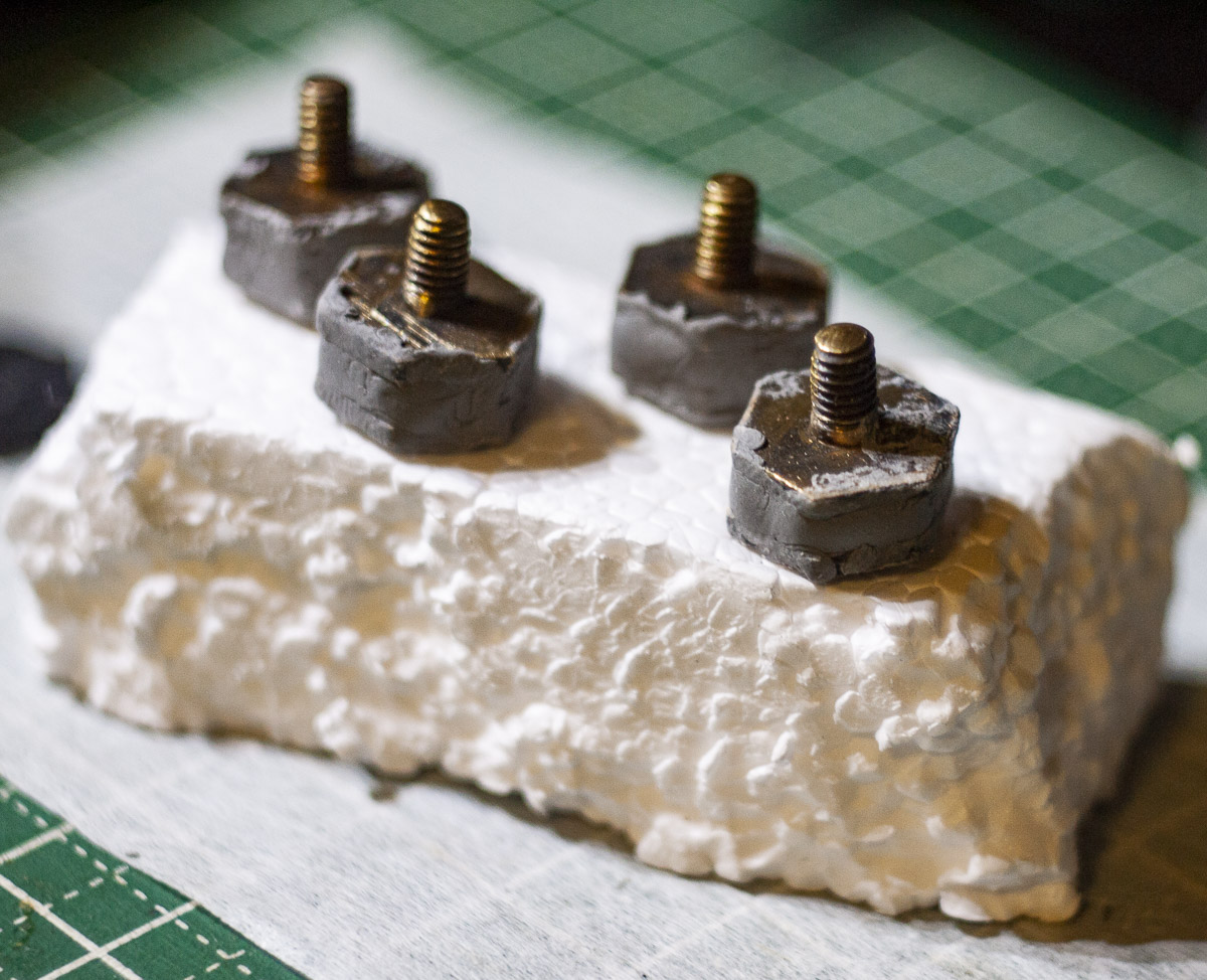 樹脂パーツを取り囲むようにメタルパテを流しこんでいきます。アルミ+有機溶剤で一回の作業の限界では1ミリ幅位。後で研磨予定ですので多少のはみ出しは気にせず盛っていきます。