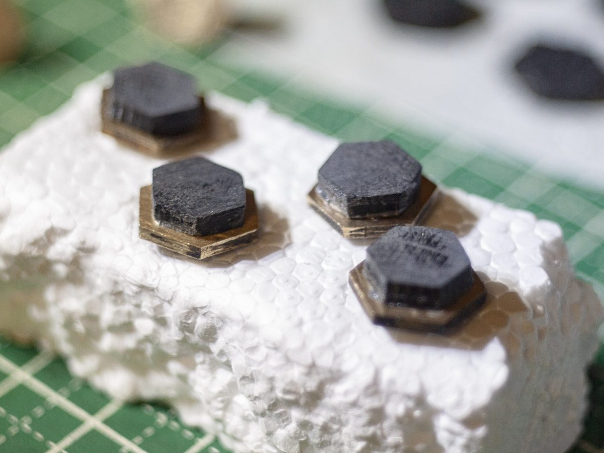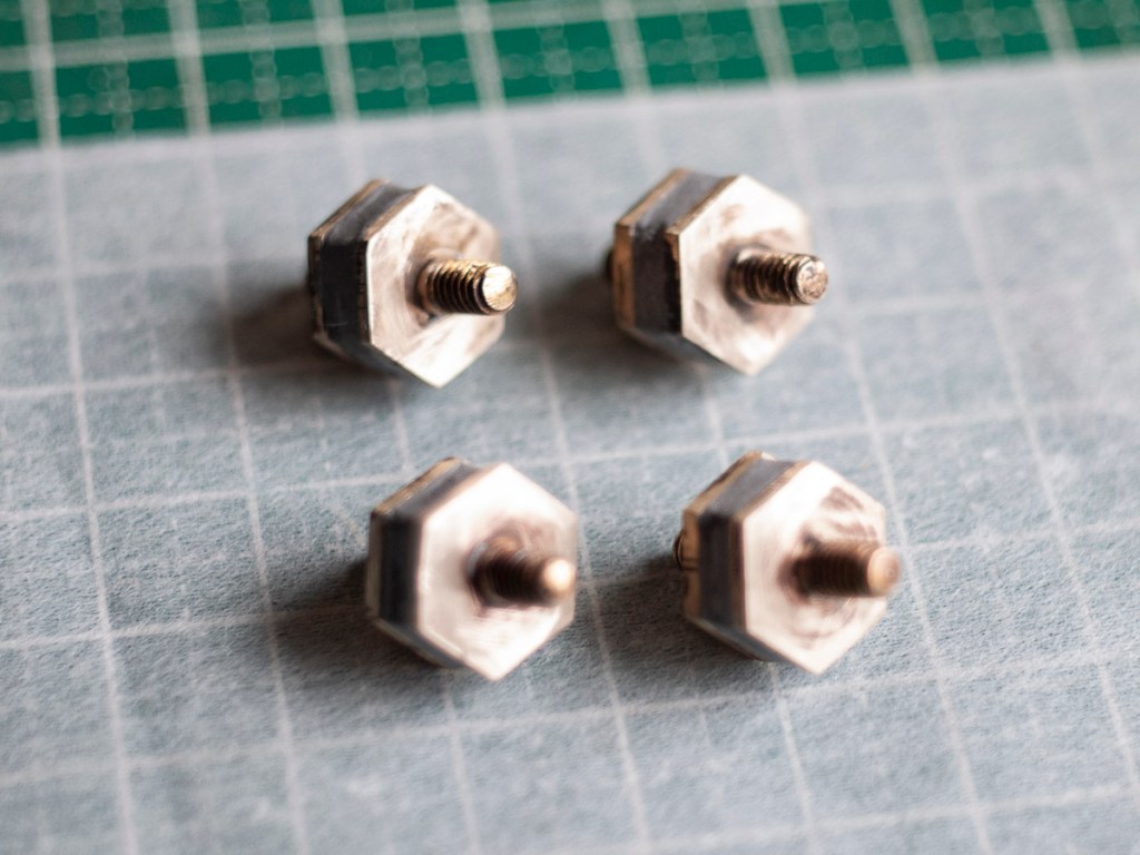 ゴム製の緩衝材は4か所とも完全に取り外すことにしました。3Dプリンタで代用パーツを作製。元々のパーツより二回りほど小さいデザインにしてあります。