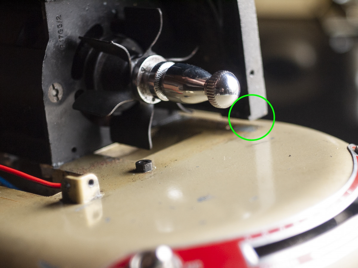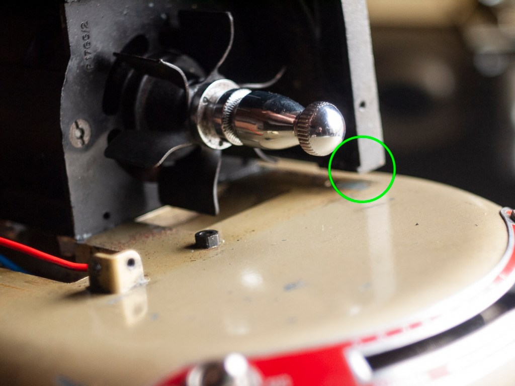 モーターを元の位置に戻していきます。ここで問題発生。ネジの飛び出た部分が引っかかってそのままでは入りません。本体の上カバーを留めているネジを外し、数ミリ浮かせる(緑丸の部分)と何とか収まりました。