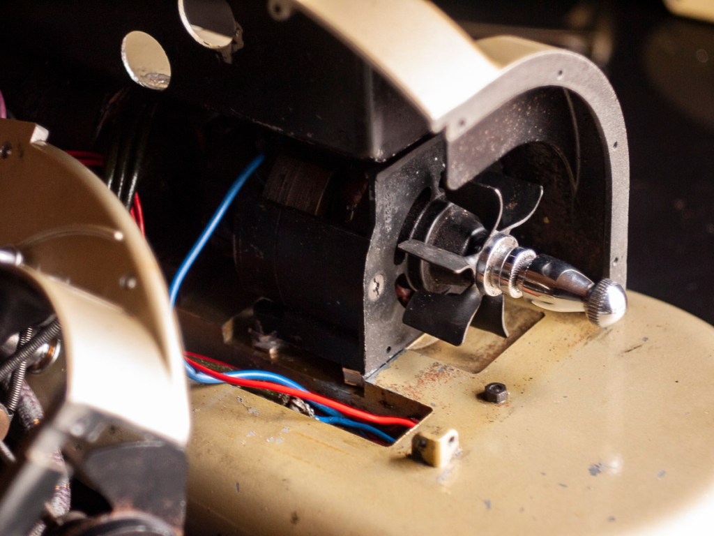 メインのモーターベルトが機能していなかったため交換で何とかなるのではないか、が前回の見立てでした。分解して状態を確認していきます。上の写真がフロント部カバーを外したところで、左側に3枚羽根のシャッターと光学関連ユニットが収められています。右に主軸とファンが見えており、その奥にモーターが置かれています。