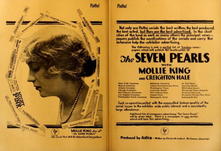 主演のイルマを演じたのはモリー・キング。1917年春~夏に公開された連続劇『二重十字の秘密』に続く主演となります。 『二重十字』は物語や設定が紋切り型に寄りすぎ、アクション要素が希薄で連続活劇としては失敗の部類に入ります。『七ツ真珠』はその失敗点を修正し、物語をシンプルにしつつもエキゾチックな要素を加え派手な見せ場を幾つか作っています。初期活劇のエッセンスを純化させた作品は好意的に受け止められ、日本でもモリー・キングの名が広まるきっかけになった一作です。