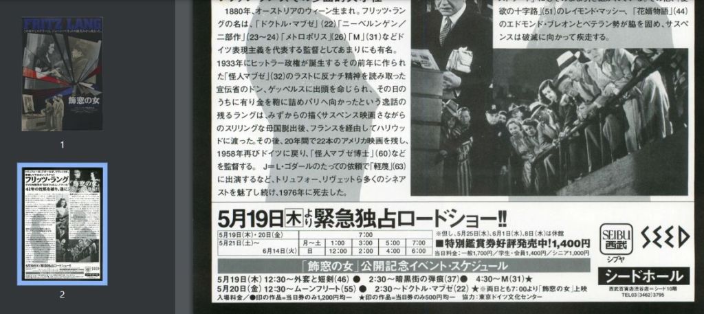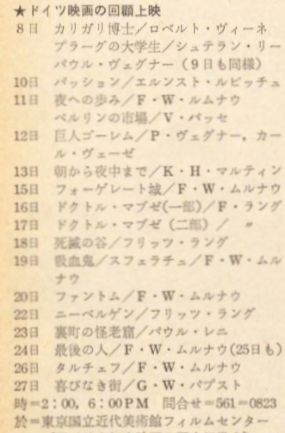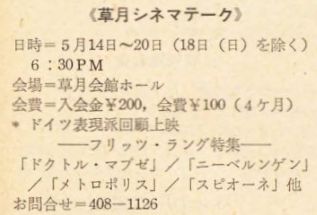 このフィルムが流通していた1970年前後はシネクラブの黄金時代に当たっていて、日本でも各地で小規模な上映会があちこちで開かれていました。1969年5月には東京(草月シネマテーク主催)と大阪(大阪シネクラブ主催)でラング特集が組まれており、1971年3月には国立近代美術館フィルムセンター(現国立映画アーカイヴ)のドイツ映画回顧上映会でもマブゼが扱われていました。