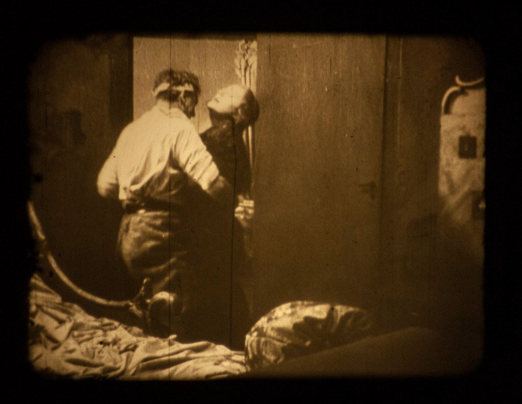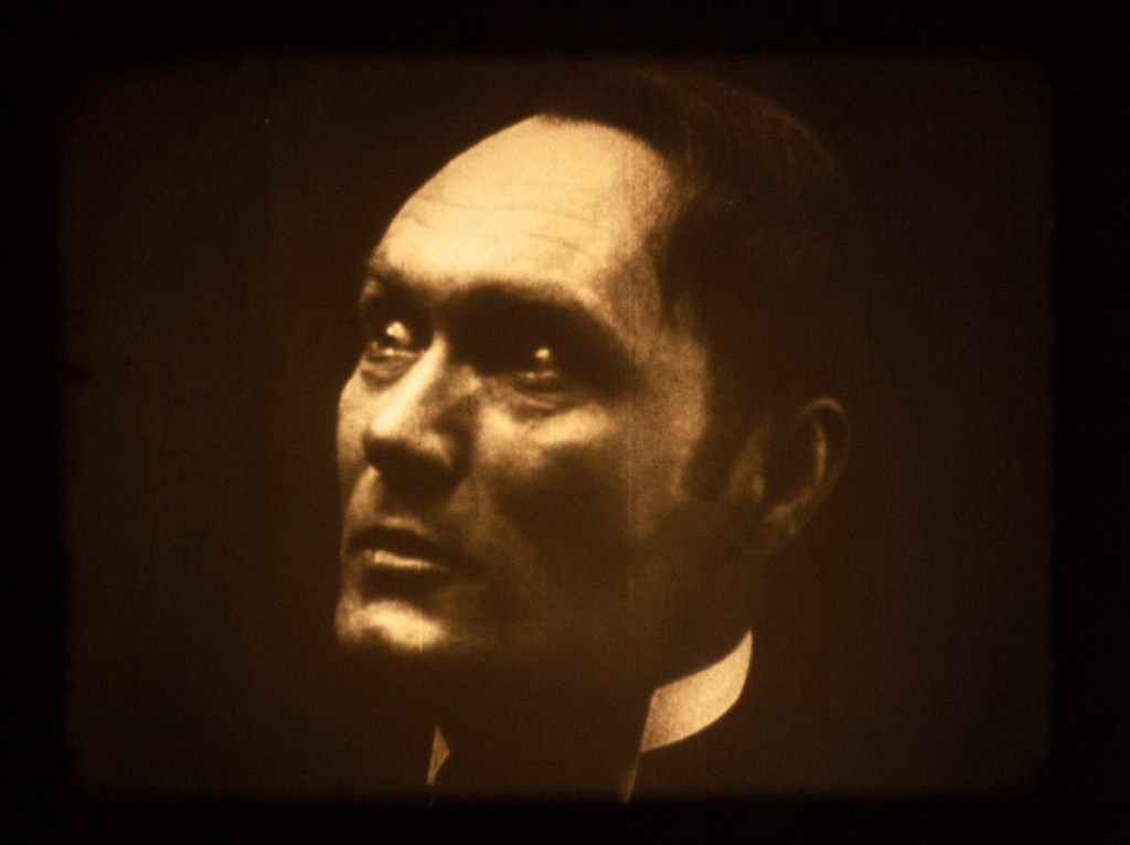 下の画像はスクリーンに実写した映像をミラーレスで撮影したもの。最初の一分程ダメージとスプライスが目立ち、後半の一部に映写痕が残っていました。4時間半に及ぶ大作の最終リールのみ実写というあまりない経験でしたが、以前に何度か見て粗筋を把握していたこともあって特に気にならない、むしろあっという間に作品世界に引きこまれていく感じでした。