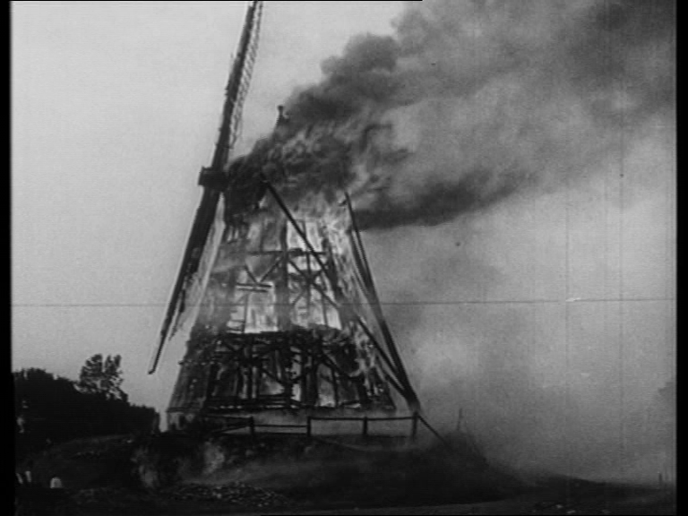 前半、風車の羽に主人公が引っかけられグルグルと回される場面があって、全景を捉えるロングショット、風車の足元から見上げる形のショット、カメラマン自身を羽に固定して撮影したショットの3種を組みあわせています。後半は風車の炎上を描いて「〇〇の消防士」のパターンに展開。フュー・オ・ビ喜劇の隠れた名作のひとつです。