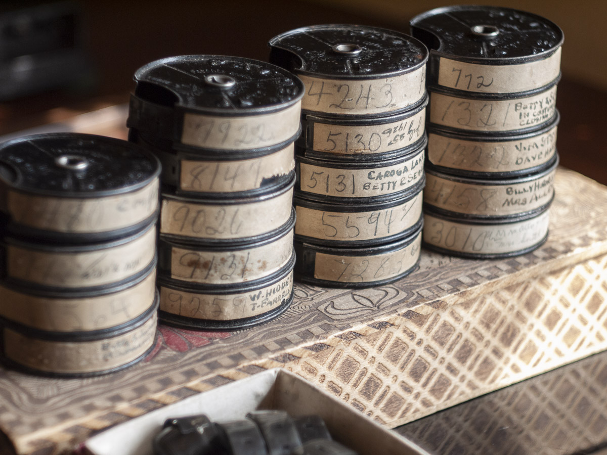 残念なことに大半のフィルムが途中で切れており、切れた部分がクルクルと巻かれてひとまとめにされていました(写真だと手前の小箱に見えるものです)。「切れ端」の分量が多く、どのフィルムに対応していたのか分かりにくいため全体を修復~実写しようとすると相当手間暇がかかりそう。