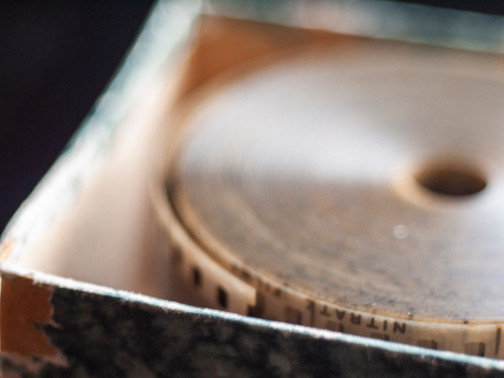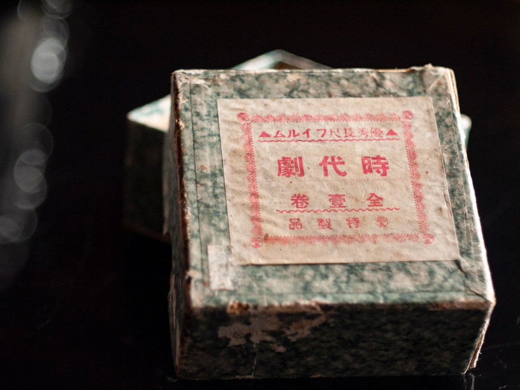 化粧箱には丸に「愛」の印が残されています。齣フィルムの発売で知られる愛和商会が市販していたフィルムだと分かります。大量複製した齣フィルムを児童向けに廉価で売り捌いていた一方、実写されたフィルムを確保するルートも有していて、それらは細切れにはせずある程度の長さで販売していたことになります。その都度都度で入手できた一品物のフィルムを扱うため作品名を明記せず「優秀長尺フイルム 時代劇 全壹巻」の漠然とした表記にしていたと思われます。