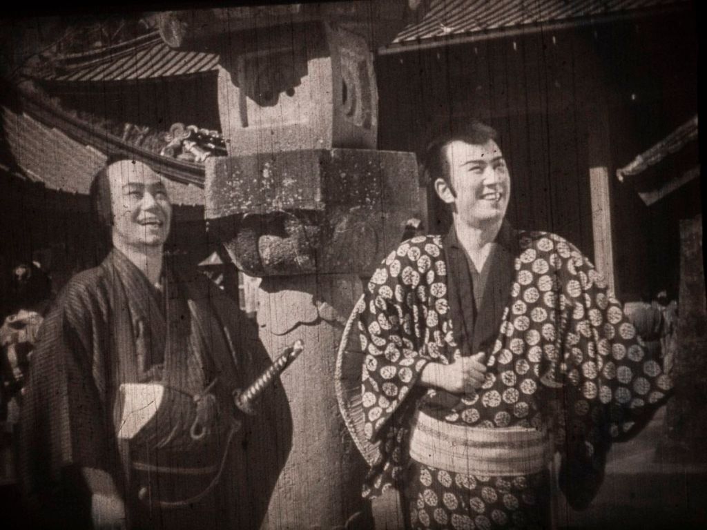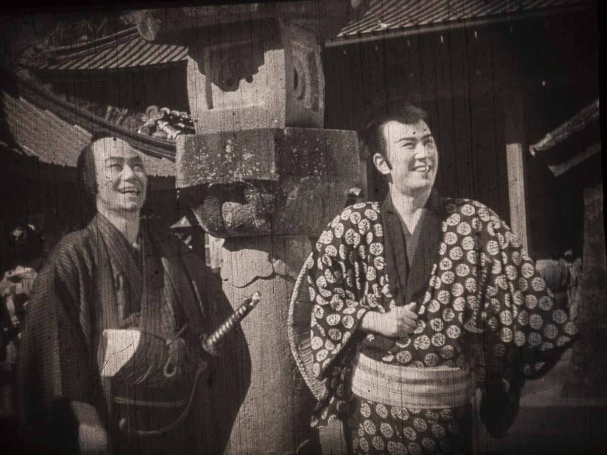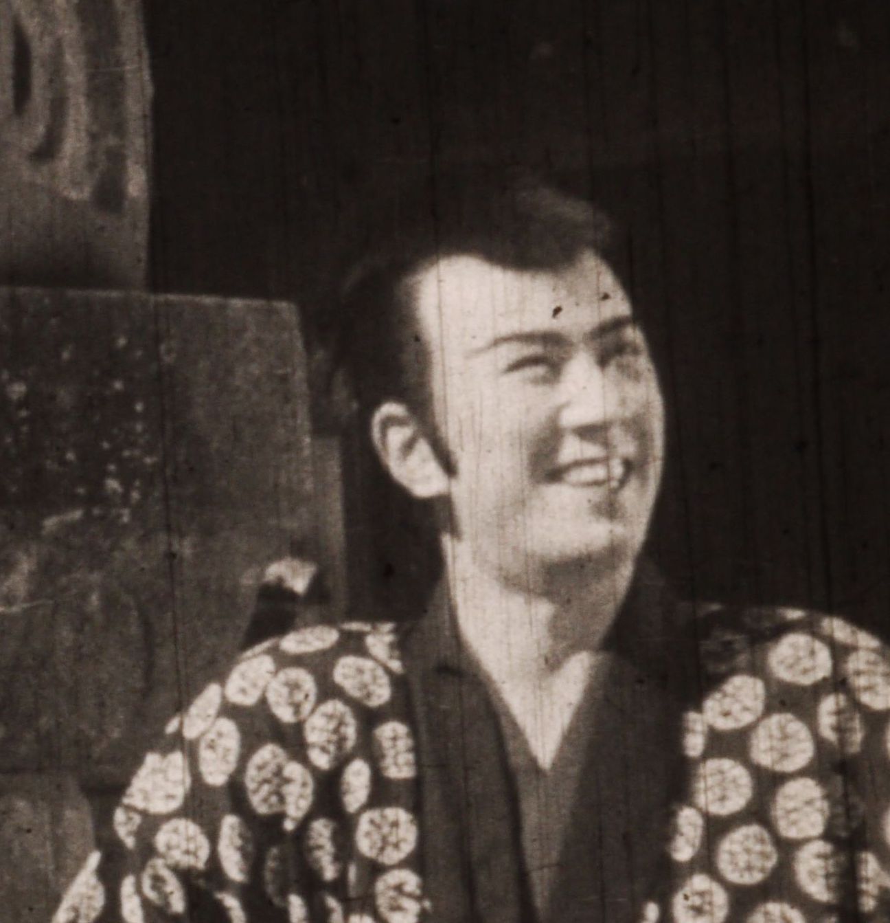 問題は第二の場面。右の俳優に見覚えがあるような…パッと名が浮かんだのは明石潮。調べ直したところ1924年に出演した『或る兄弟と城主』の写真を見つけました。眉の作り方が異なっているものの頬から顎の輪郭や鼻の形、髪の生え際からもみあげまでのラインが重なるかな、と。高木新平、明石潮両氏は短期間(1924年後半から25年初頭)同時期に東亞に所属、共演は十分ありえます。どちらかの出演データに対応する配役や筋書きの作品が見つかれば一件落着ですが…