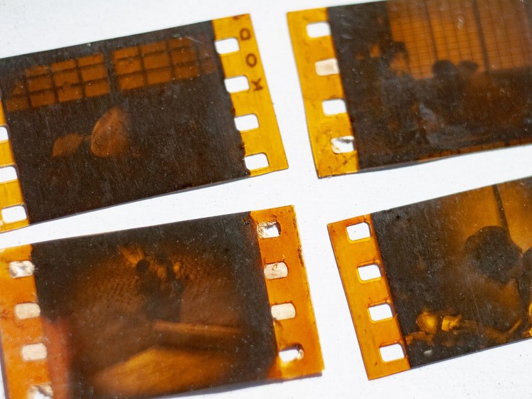 まず第一の作業として厚紙の枠を崩して齣フィルム全体を裸にし、染色(調色)のパターンから同一作品と思われるフィルムをまとめていきました。その結果最初の一枚と同じタイプの齣が他に少なくとも三枚見つかりました。