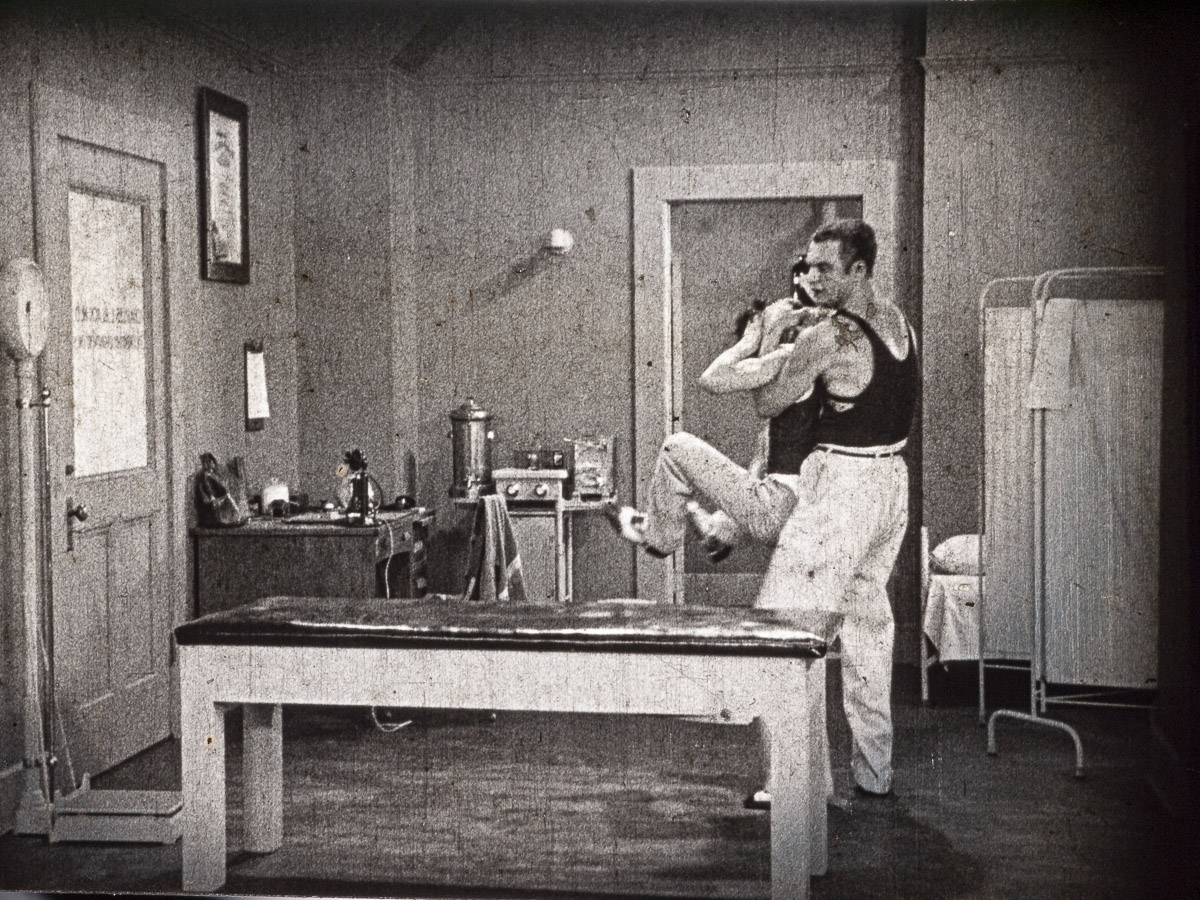 2)カンターが恋敵(マルコム・ウェイト)から電気椅子療法と手荒なマッサージを受けている場面。