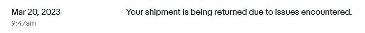 購入したのが2023年3月14日。ところが一週間してから米国の税関で引っかかり発送元(オレゴン州)に返送されたとのメールが届きました。追跡情報を確認した所、確かに戻されています。