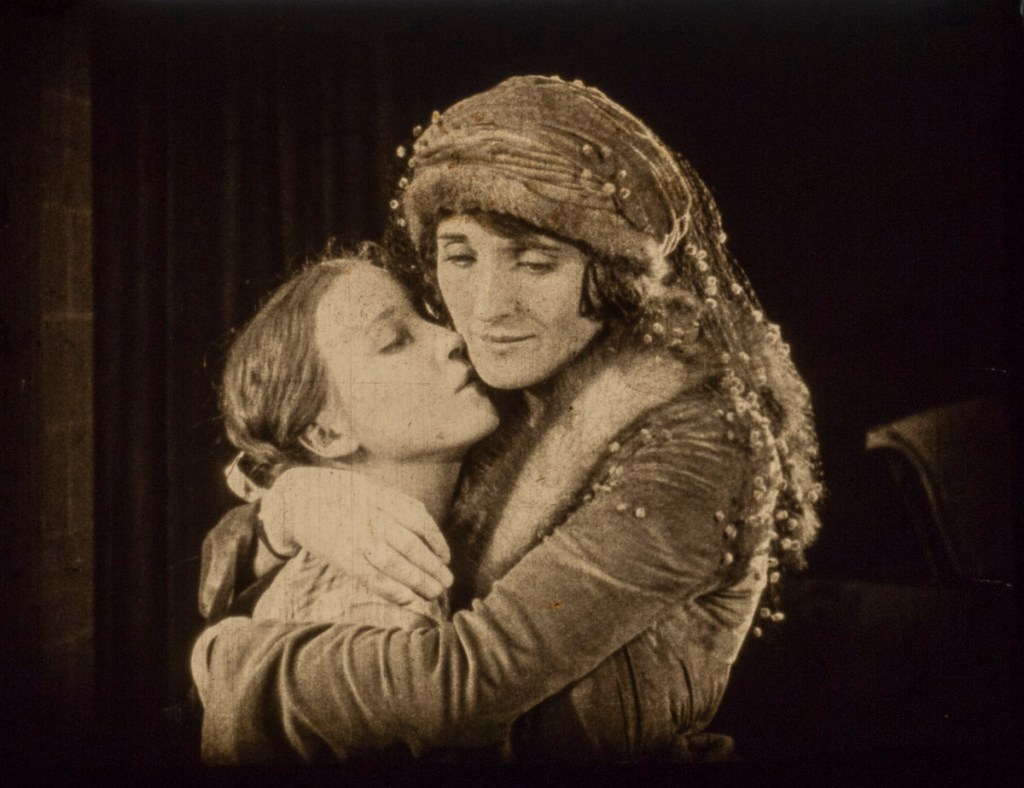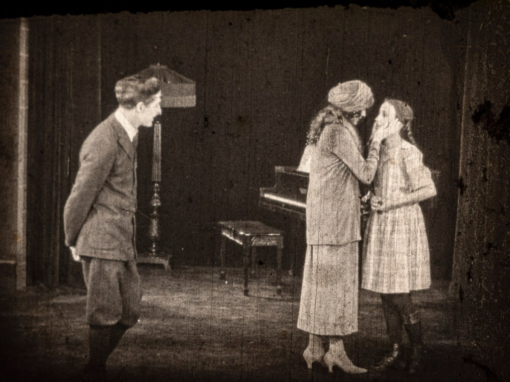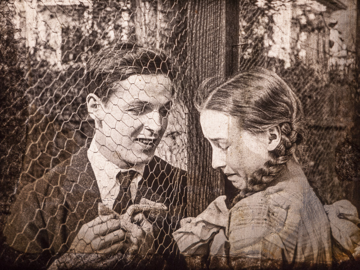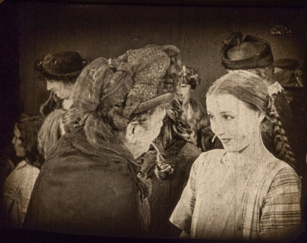 齣フィルムは21枚あって染色パターンで2グループに分かれています。1つ目のグループはピンク色がかった調色をほどこされた屋外撮影の場面3枚。孤児アン(ベッシー・ラブ)とその恋人ジミー(ギャレス・ヒューズ)が金網越しにやりとりしている様子が収められていました。