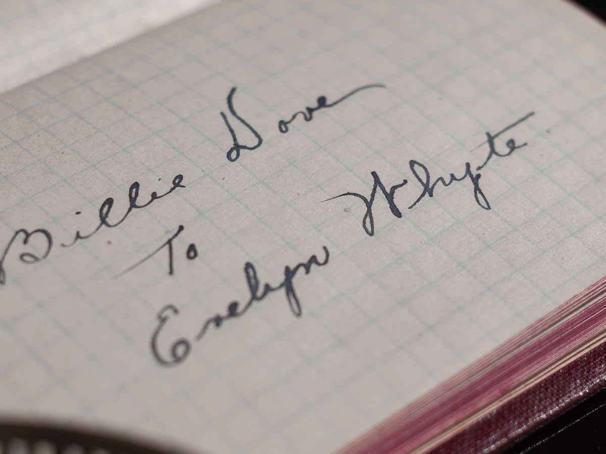 サインは「エヴェリン・ホワイト嬢へ」の宛名が付されたもの。大文字「D」を一筆書きし最後右下から右上へと跳ね上げる手癖が特徴です。