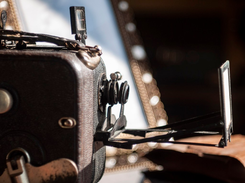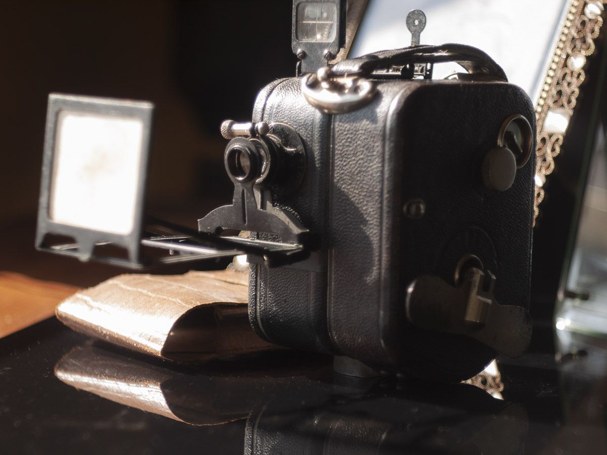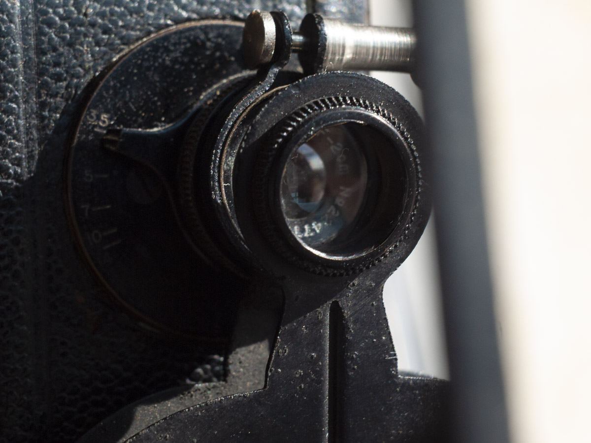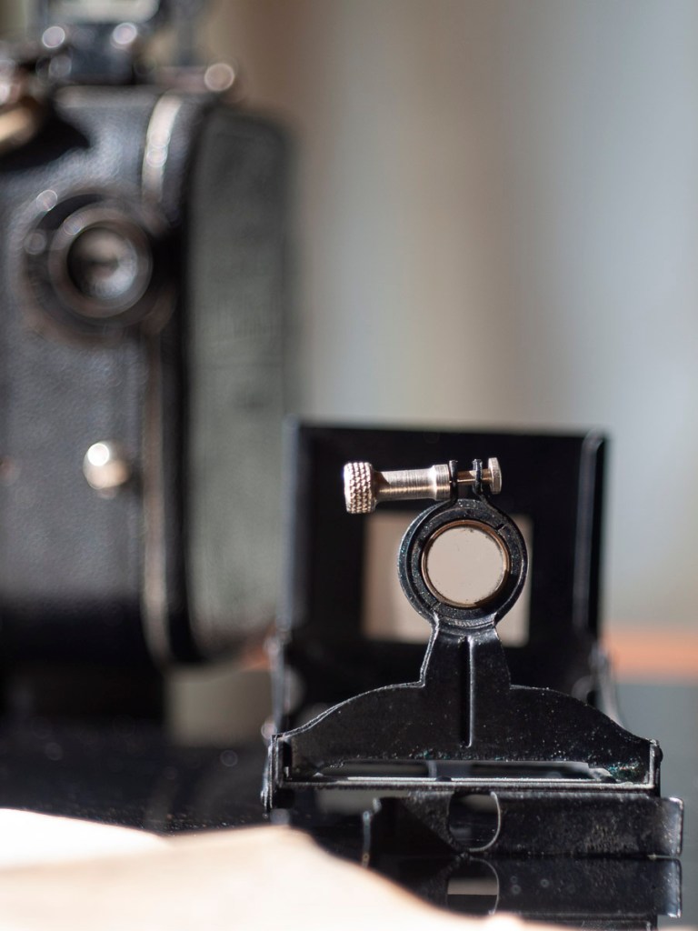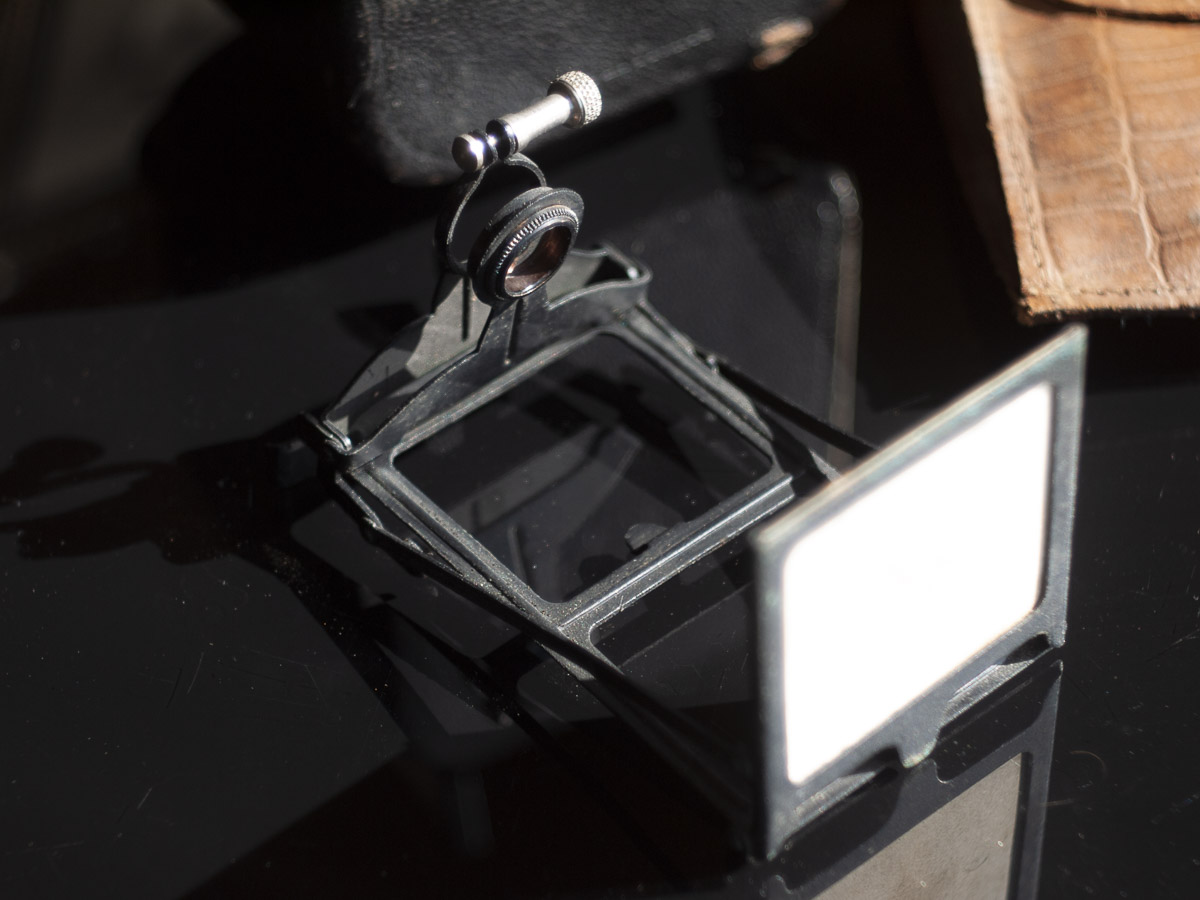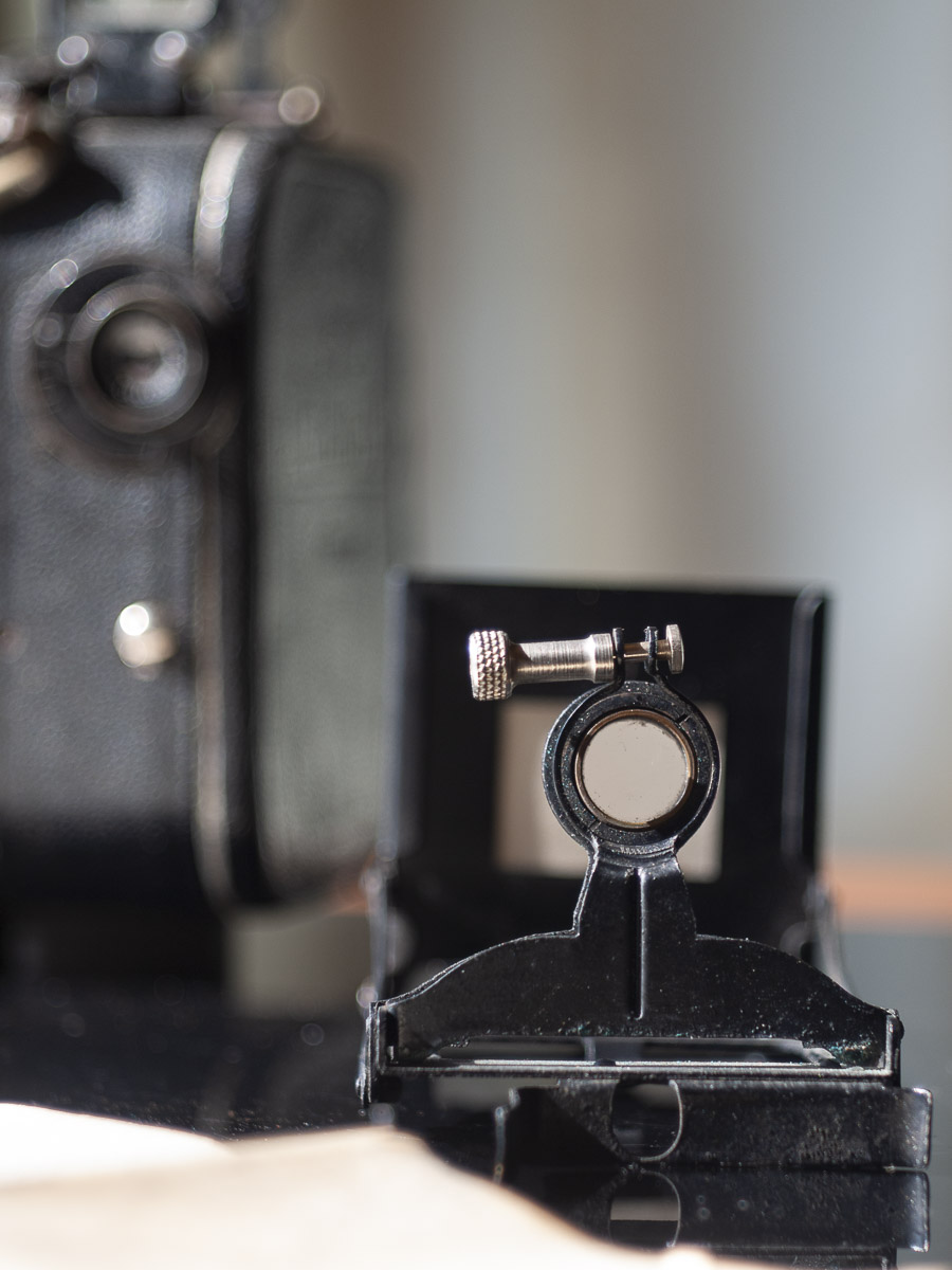 アームの先に字幕設置用のキャンバス部が立っているシンプルな構造。1920年代のパテ社製動画カメラは接写ができないため、タイトラー自身にクローズアップレンズが仕込んであるのが特徴です。