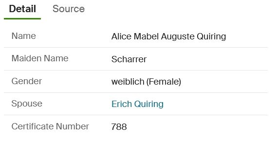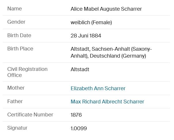 1920年代中盤に再婚しており名字がクヴィリングに変わっています。1927年に「マーベル・クヴィリング」としてアフリカに出発した乗船記録あり(データ3より)。沒年月日は不詳ながら、死亡証明を見るとアリス・マーベル・アウグステ・クヴィリングとして亡くなっています(データ4より)。