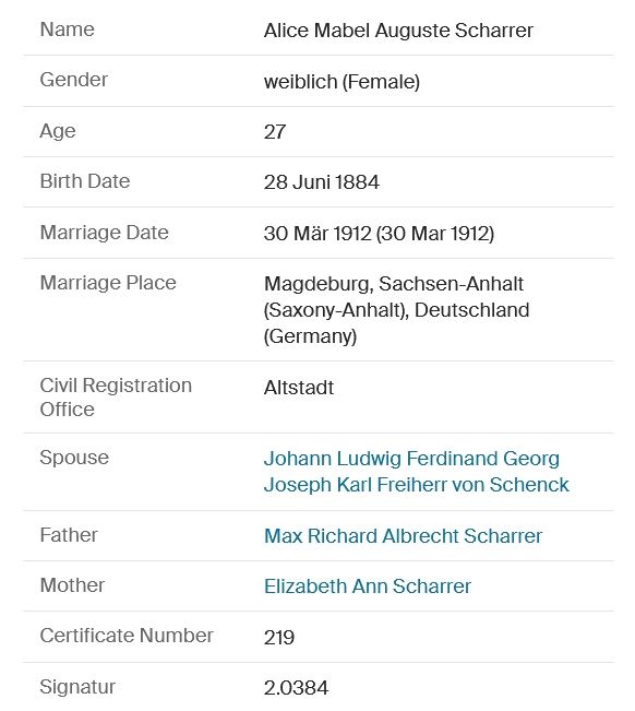 本名アリス・マーベル・アウグステ・シャレル。1884年6月28日アルトシュタットで父マックス・リヒャルト・アルベルト・シャレル、母エリザベス・アン・ホアマイの間に生まれる(データ1より)。1912年3月30日に結婚。結婚相手は男爵(ヨハン・ルートヴィヒ・フェルディナント・ゲオルク・ヨゼフ・カール・フライヘル・フォン・シェンク・ツー・シュヴァインスベルク氏)でした(データ2より)。
