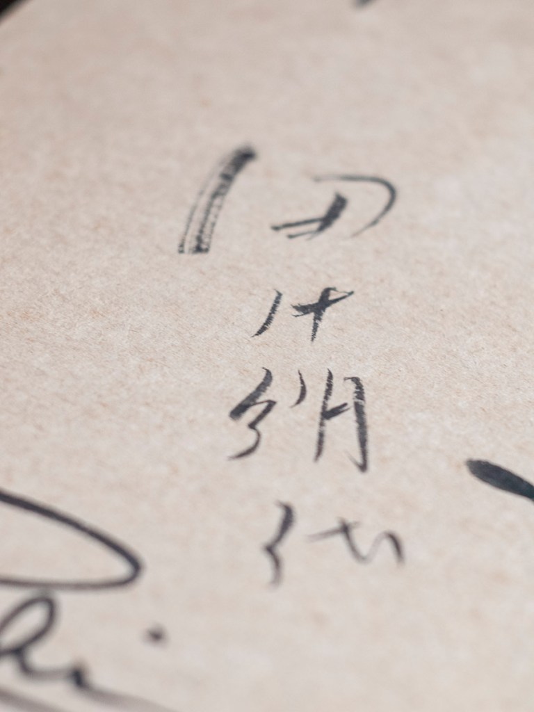 昭和2年(1932年)前後、松竹蒲田スタジオスタッフの寄書き入り色紙。裏面に手書きで7人の名が記されています。