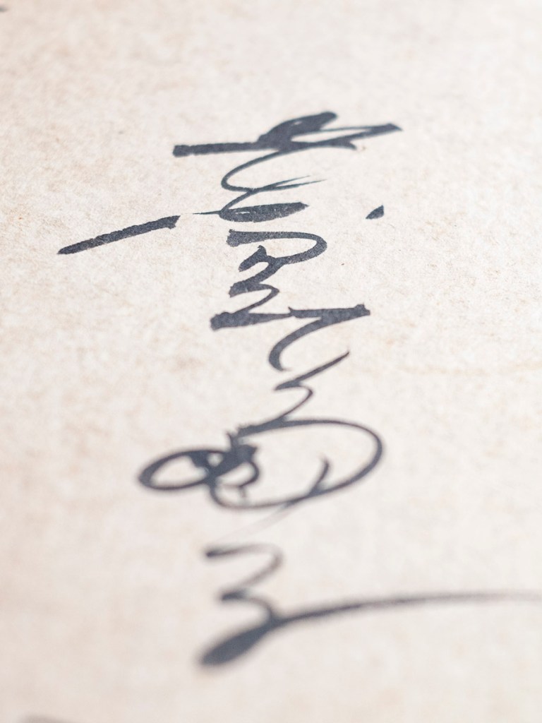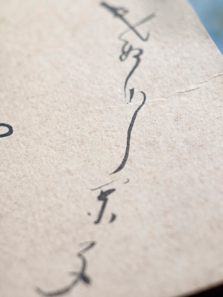 五所平之助氏は俳人でもあって、色紙や短冊に残した歌が時々市場に出てきます。基本「平之助」か「五所平之助」とサインしているのですがこちらの色紙では名字が平仮名表記、しかも「ご」を「古」から派生した変体仮名を使って表記しています。